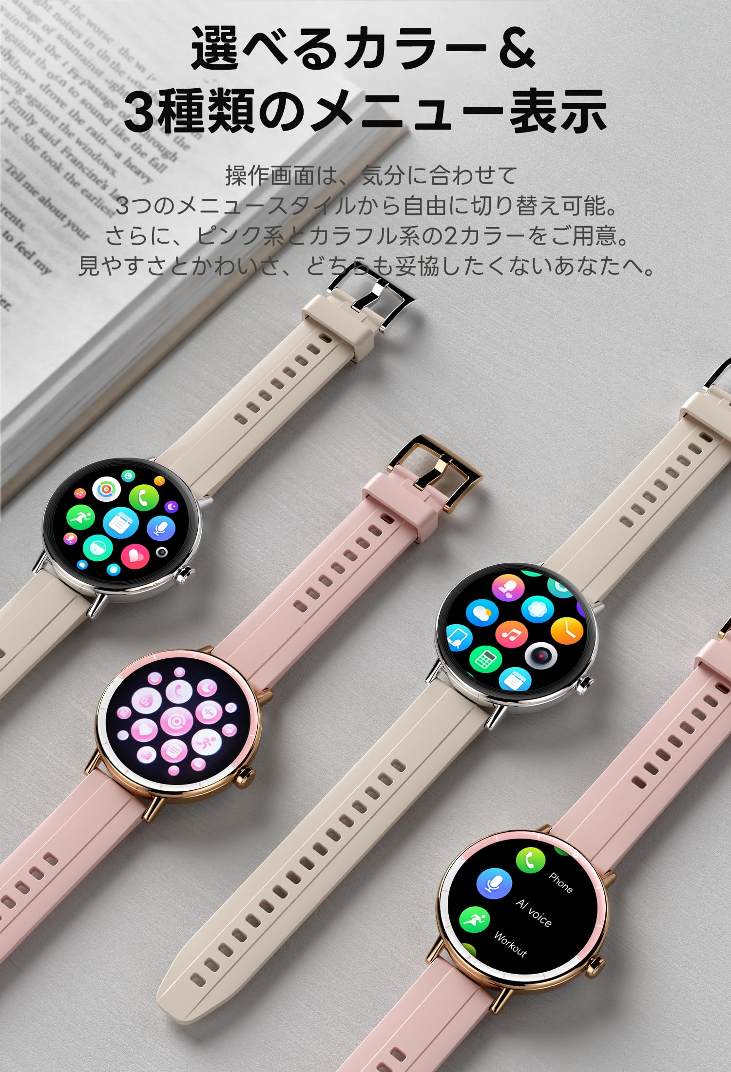 * 【レディース向けのおしゃれ設計・女性の生理周期管理】スマートウォッチ は小さな手首にもぴったりフィットするコンパクトな丸型デザインで、可愛さと機能性を両立。高解像度1.27インチディスプレイは、日差しの下でも視認性が高く、毎日身に着けたくなる美しさ。女性のための健康管理機能も充実しており、生理周期の予測、体調リマインドなどもアプリで簡単に設定可能。自分をもっと知り、もっと大切にしたいあなたへ。