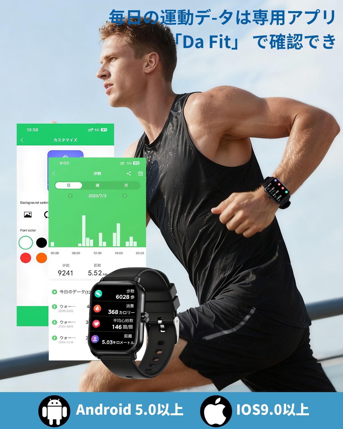 * 「1.85インチの大型鮮明画面で」視認性と操作性が大幅向上、広々とした1.85インチの高解像度スクエアスクリーン。文字や情報がくっきり見やすく、タッチ操作も快適。好みに応じて多数の文字盤から選べ、ファッションや気分に合わせてカスタマイズ可能。
