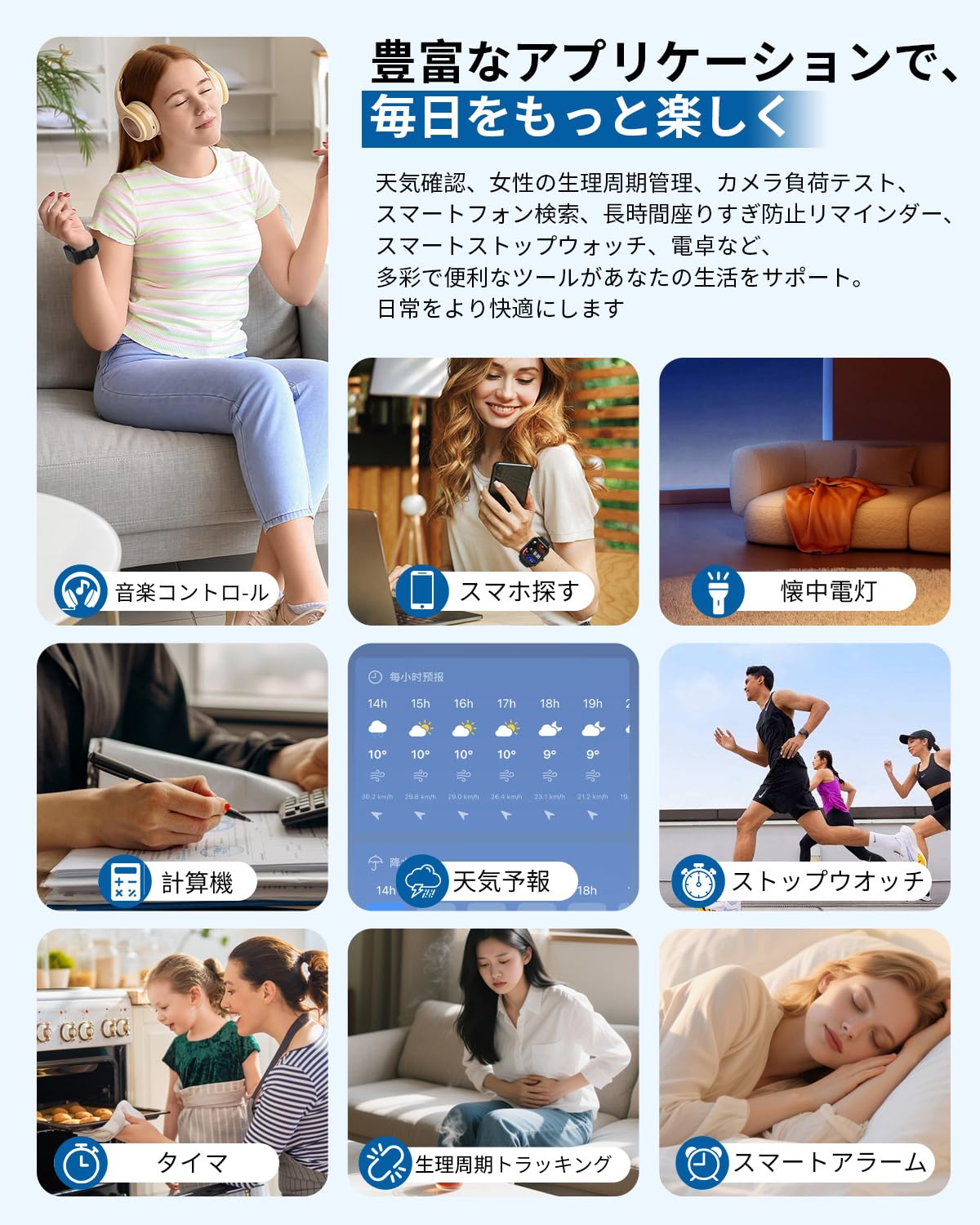* 「100種類以上の運動モードを搭載、あらゆる活動を記録」ランニング、水泳、ヨガから登山、ボクシングまで、多彩な運動を自動検出・記録。心拍数、消費カロリー、運動時間などのデータを詳細に分析し、目標達成をサポートします。