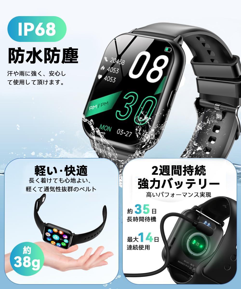 スマートウォッチ【最新進化モデル】iPhone対応&アンドロイド対応 1.9インチ業界HD大画面 通話機能付 SMS/Line通知 Bluetooth通話機能 薄型軽量 スポーツウォッチ バンド交換可能 Smart Watch 音楽再生 活動量計 多機能スマートウォッチ 多種類運動モード IP68生活防水 メッセージ通知 腕時計 天気予報 レディース メンズ 多種類文字盤