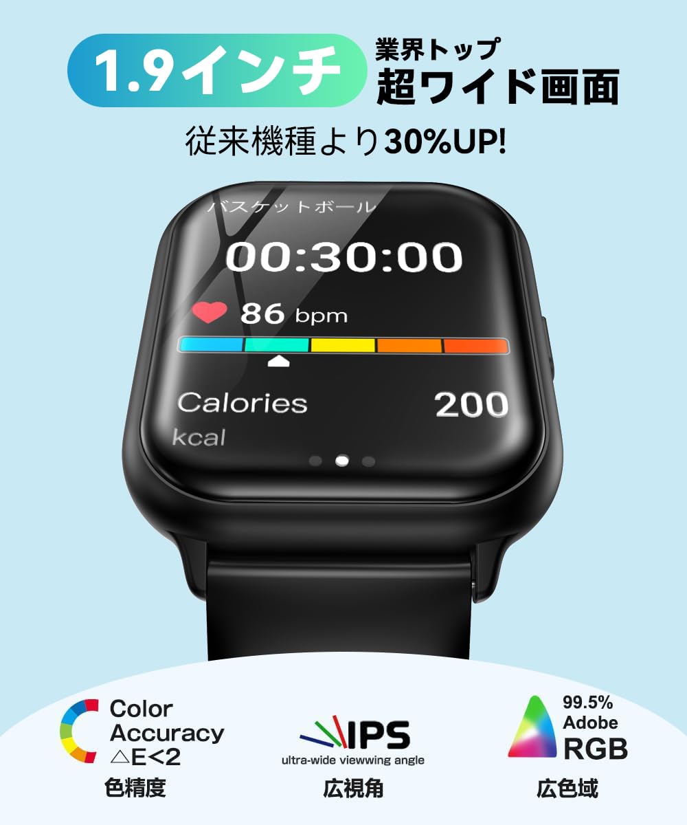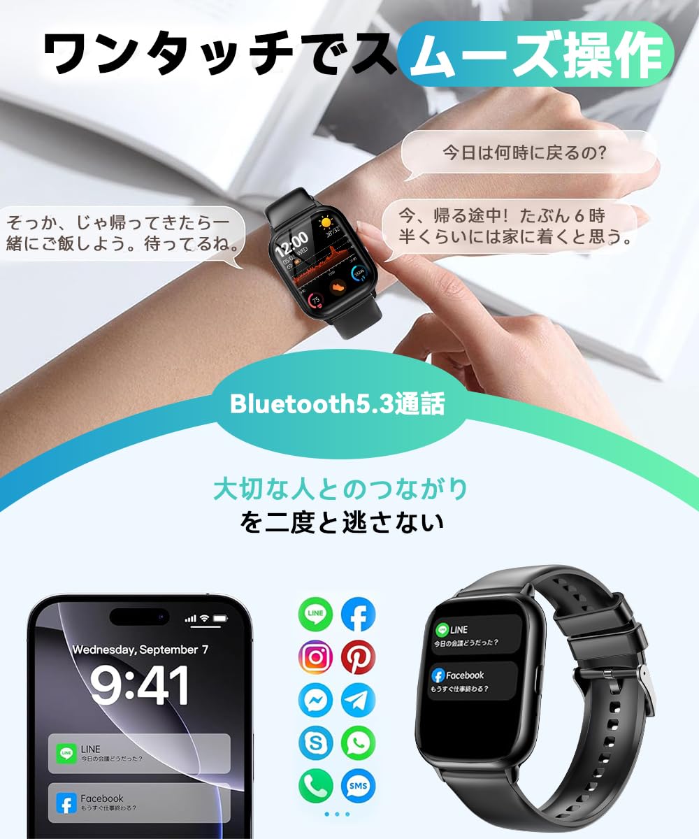 * 【1.9インチHD大画面・なめらかな操作性】240×284ピクセルの高解像度を備えた1.9インチ大画面ディスプレイを搭載し、文字やアイコンも見やすく、鮮やかな表示を実現。なめらかなタッチ操作で直感的に画面を切り替えられ、スマートフォン感覚の操作性を体感できます。独自OSにより画面遷移もスムーズで、初めての方でも扱いやすい設計。着信や各種メッセージ通知を手元で素早く確認でき、日常管理を効率化します。Android・iPhone両対応で、ペアリングも簡単。腕を上げると画面が点灯する手首検知機能を搭載し、必要な情報をすぐに確認可能。文字盤もワンタッチで変更でき、気分やシーンに合わせたカスタマイズを楽しめます。