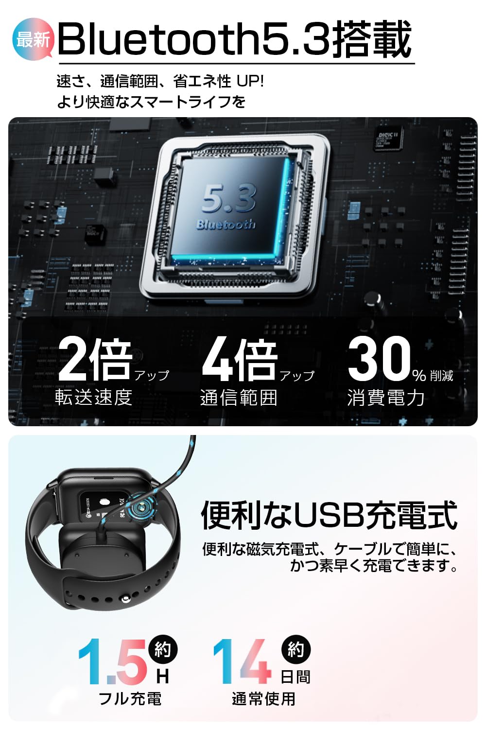 * 【長時間駆動 充電のわずらわしさから解放】 内蔵の350mAh高性能バッテリーと低消費電力チップにより、消費電力が40%大幅に削減され、駆動時間が著しく向上しました。満充電時には、高強度の連続使用で7~10日、通常の待機時では最大30日間の駆動を実現。さらに、わずか100分での高速フル充電が可能です。