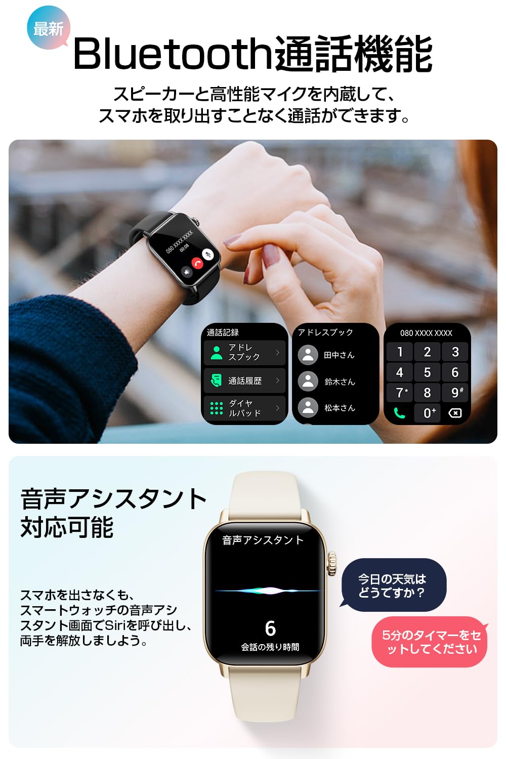 * 【Bluetooth 5.3 どこでもつながる快適通信】 新たにアップグレードされたBluetooth 5.3を搭載し、iphoneとアンドロイドの両方で対応可能。メッセージや音楽、健康データの同期がよりスムーズになり、端末が離れた場所にあっても安定した接続を維持します。さらに、通話システムも新たにアップグレード。スマートウォッチで連絡先の確認、ダイヤル操作が可能になり、より便利な日常生活をお届けします。
