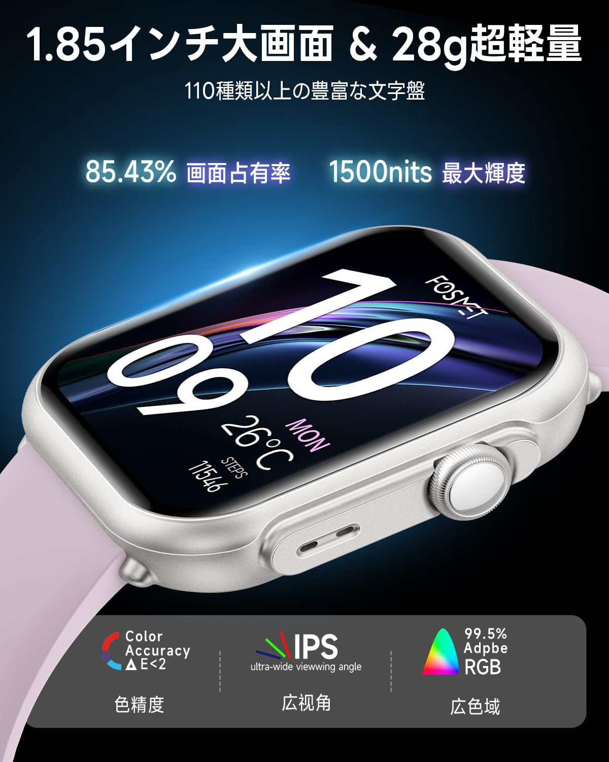 FOSMET P1 スマートウォッチ【2025新モデル·バッテリー最強】100日間スタンバイ 30日間連続使用 Bluetooth通話機能 1.85インチHD大画面 IP68防水 1500nit高輝度 明るさ調整 メッセージ通知 睡眠管理 120種類の運動モード 音楽再生 軽量28g 多種類文字盤 天気予報 スマートウォッチ iPhoneとアンドロイド対応 TELEC認証 パープル