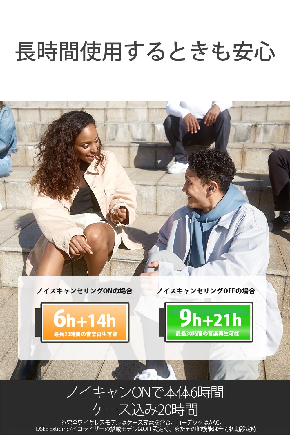 * ノイキャンON時は最長20時間と長時間使用可能なロングバッテリーライフと突然の外出時も安心なクイック充電にも対応。さらに、どんなスマホ(XperiaもiPhoneも)でも音切れしにくい高い接続性や雨や汗を気にせず楽しめる防滴性能等充実した基本性能を実現