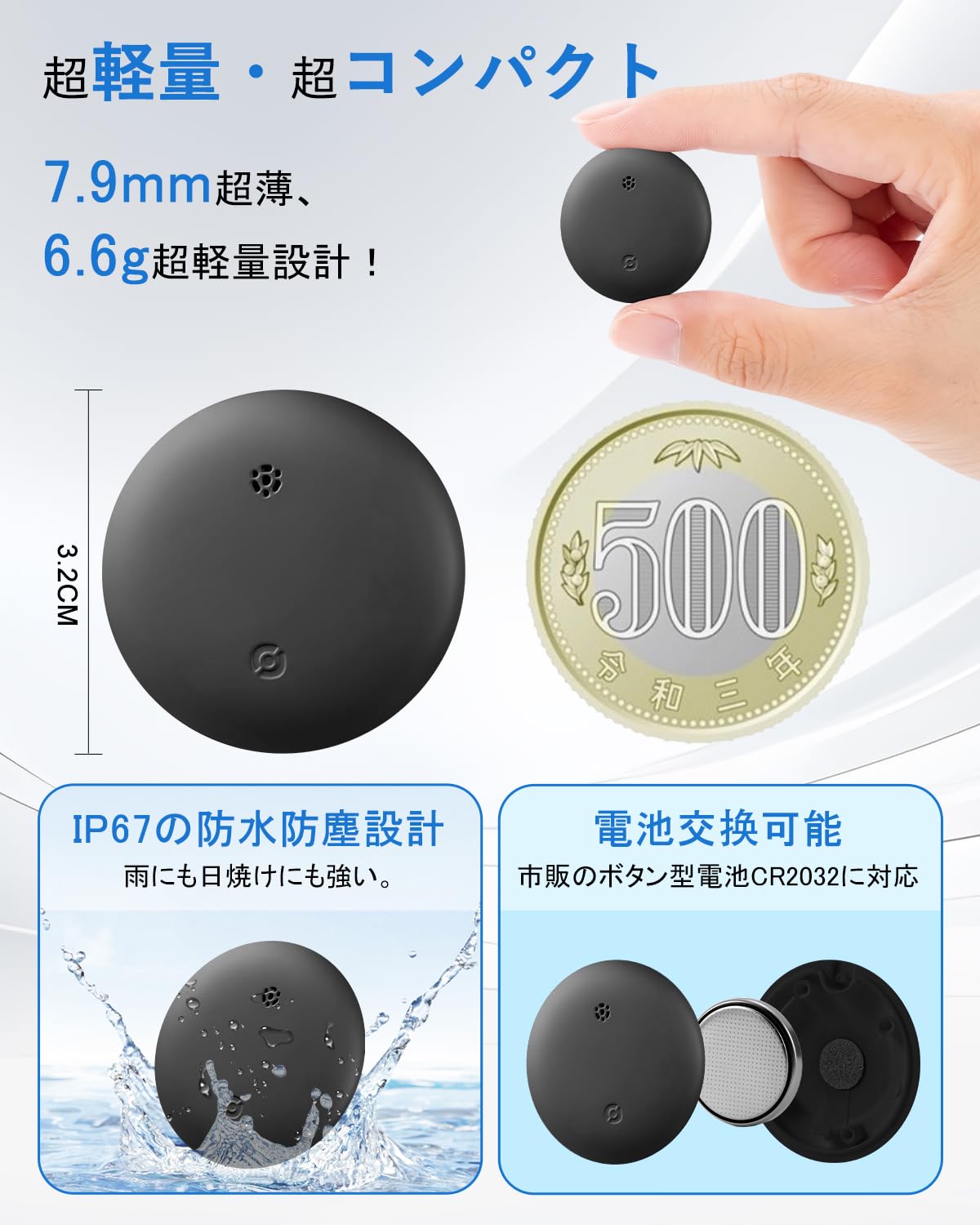 * 【超薄超軽量&長寿命・電池交換可能】超薄デザイン、コインサイズで厚さはわずか0.79cm、重さは6.6gで携帯に便利、いつでもどこでも使用可能!長持ちするバッテリーと交換可能なバッテリーを搭載しており、アプリを通じて残量を確認できます。また、市販のCR2032ボタン電池にも対応しています。IP65防水防塵:突然の雨や飛び散る水しぶきから完全に守られ、雨の日の通勤時にバッグを外に掛けても心配なし。防塵シールで、ほこりの侵入を0に防ぎます。