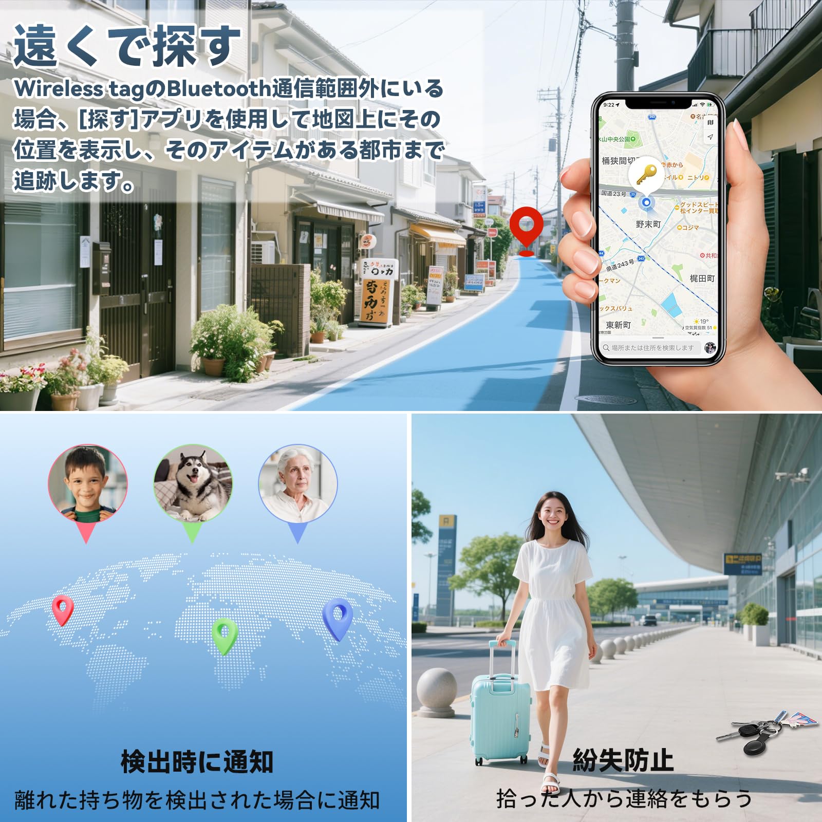 * 【全地球精確な測位&MFI認証済み】最新GPS技術を搭載したスマートトラッカーはリアルタイムで位置を表示できます。iPhone、iPad、Macデバイスの「探す」ネットワークを利用して、紛失防止タグは位置情報を特定できます。世界中どこでも追跡可能。学校への通学中のお子様の見守りや、車の盗難防止。弊社の紛失防止タグはMFI認証済みで、Apple公式ウェブサイトのMFI認証の所で「Wireless tag」を検索すれば認証済みの正規商品であることが分かります。(ご注意:iOSのみ対応、Androidは対象外です。)