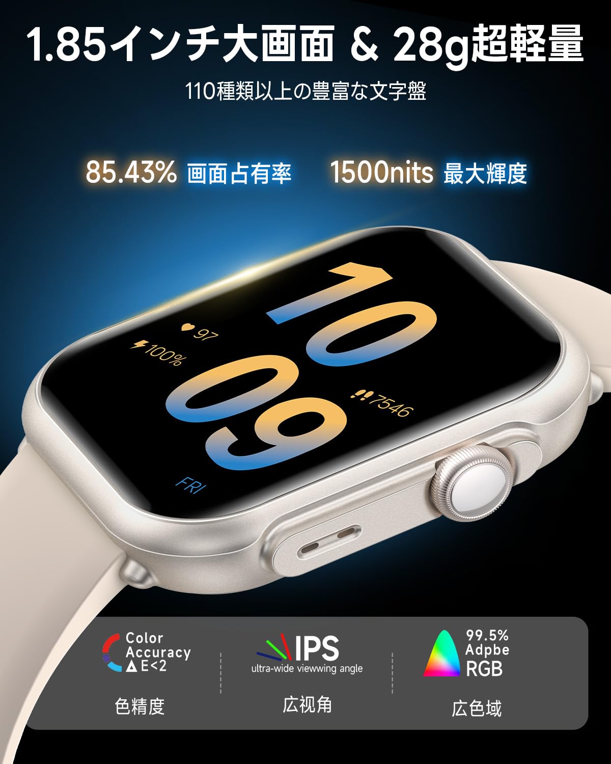 * 【1.85インチ高精細大画面&110種類以上の文字盤】1.85インチの大型ディスプレイは、解像度が高く、明るく鮮やかな表示を実現します。画面占有率は85.43%、最大1500nitsの高輝度で、画面の明るさを調整でき、屋外でも夜間でも視認性は抜群です。アプリを通じて110種類以上の文字盤からお好みのデザインを選べるほか、お好きな写真を文字盤としてカスタマイズすることも可能です。シンプルで洗練されたデザインは、ビジネスにもプライベートにも自然に馴染みます。