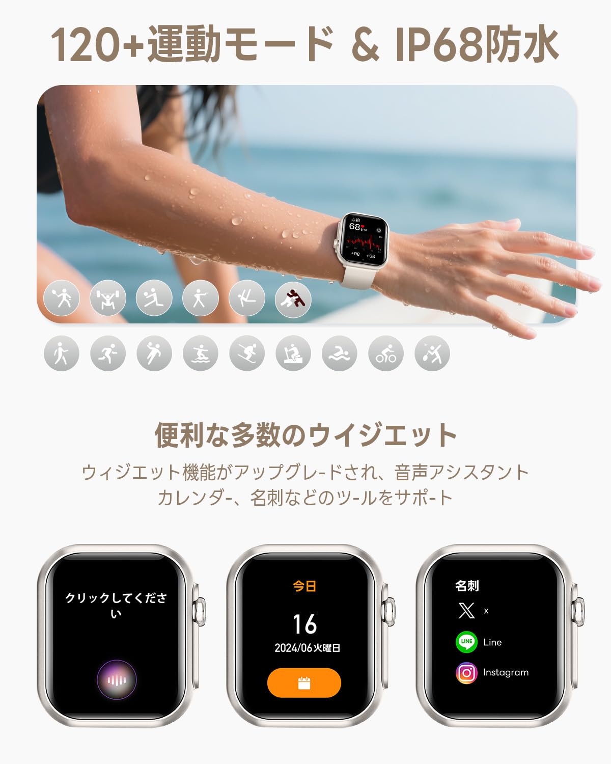 * 【120種類のスポーツモード&IP68防水・多機能状況管理】本スマートウォッチにランニング、ウォーキング、サイクリングをはじめとした120種類のスポーツモードを搭載し、日々の運動をしっかり記録・サポートします。IP68の防水・防塵仕様で、手洗いや汗をかく場面でも安心してご使用いただけます(※高温の浴場・サウナ・温泉での使用は不可)。状況管理機能も充実しており、心拍数・血中酸素の常時モニタリング、座りすぎ・水分補給リマインダー、呼吸トレーニング機能も搭載してます。さらに、睡眠管理により30日間の睡眠状態を記録・可視化。女性向けの月経周期管理機能も備え、日常の健康をトータルでサポートします。