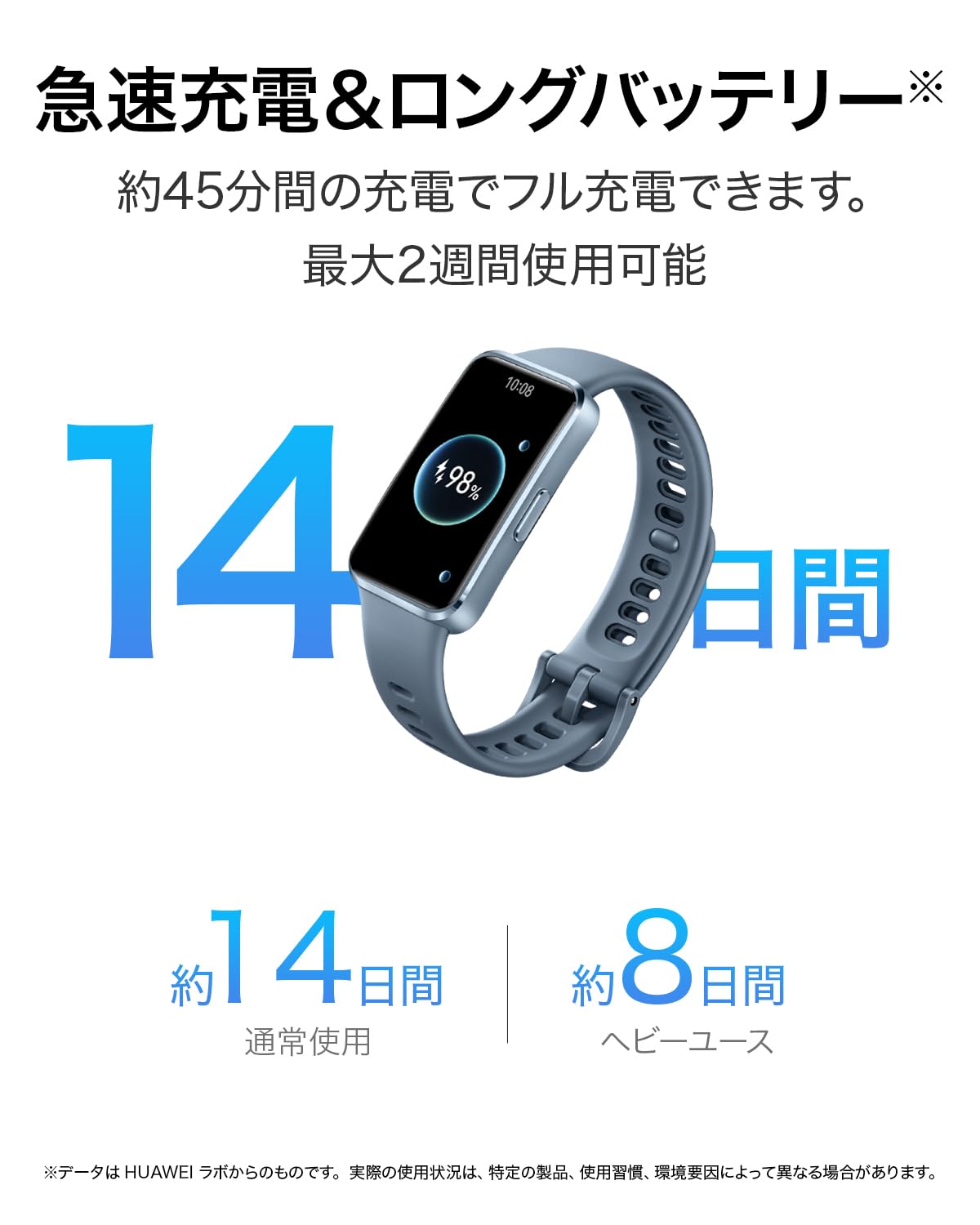 * 【パワフルバッテリー&急速充電】 わずか5分間の充電で2日間使用でき、約45分間の充電でフル充電。通常使用で約14日間使用のパワフルバッテリーは、充電することを忘れてしまうほど長持ち。充電を気にせずに毎日使用できます。 【幅広い互換制】 Android & IOS両方のデバイスにペアリング可能。 【幅広いカラーバリエーション】 スタイリッシュなHUAWEI Band 10 Aluminum Editionは、耐久性のあるフルオロエラストマーベルトを使用。マットブラック、ホワイト、ブルー、パープル、グリーンのカラーからお好みのBand10をお選びください。
