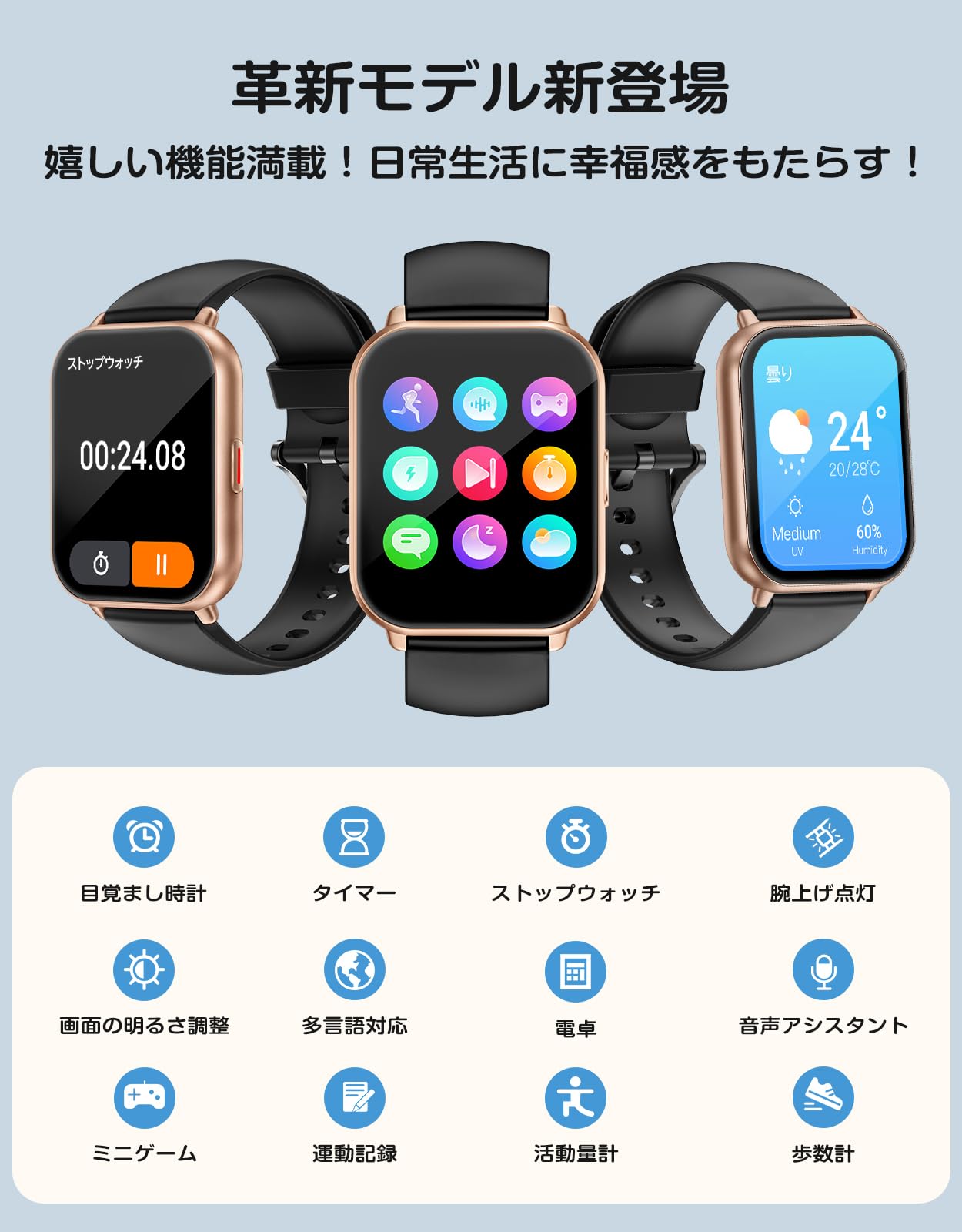 RUIMEN スマートウォッチ iPhone アンドロイド対応 通話機能付き Smart Watch 歩数計 腕時計 着信&メッセージ通知 懐中電灯 天気予報 音楽制御 100+種類運動モード 文字盤 IP68防水 長持ちバッテリー ストップウォッチ 目覚まし時計 長座注意 スマホ探す 日本語説明書 交換バンド付属