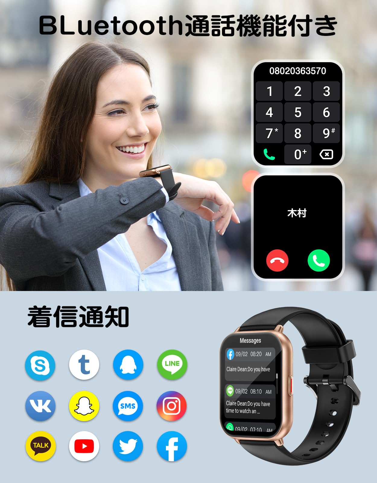 * 【Bluetooth通話機能付き&着信通知】スピーカーと高性能マイクを内蔵し、スマホを取り出すことなく通話ができるスマートウォッチで、毎日の仕事や生活、ドライブに大きな利便性を提供します。専用アプリと接続すると、スマートウォッチから直接電話をかけたり、応答したり、スピーカー機能をオンにしたりできるほか、通話履歴の確認や通話履歴の保存も可能です。 通話相手の名前と電話番号が時計に表示されます。また、smart watchには音声アシスタント機能が搭載されています。 さらに、LINEやFacebook、Twitterなどの通知もお知らせしてくれるので、大切なメッセージを見逃すこともありません。通知の振動の強さは、時計側で設定できます。
