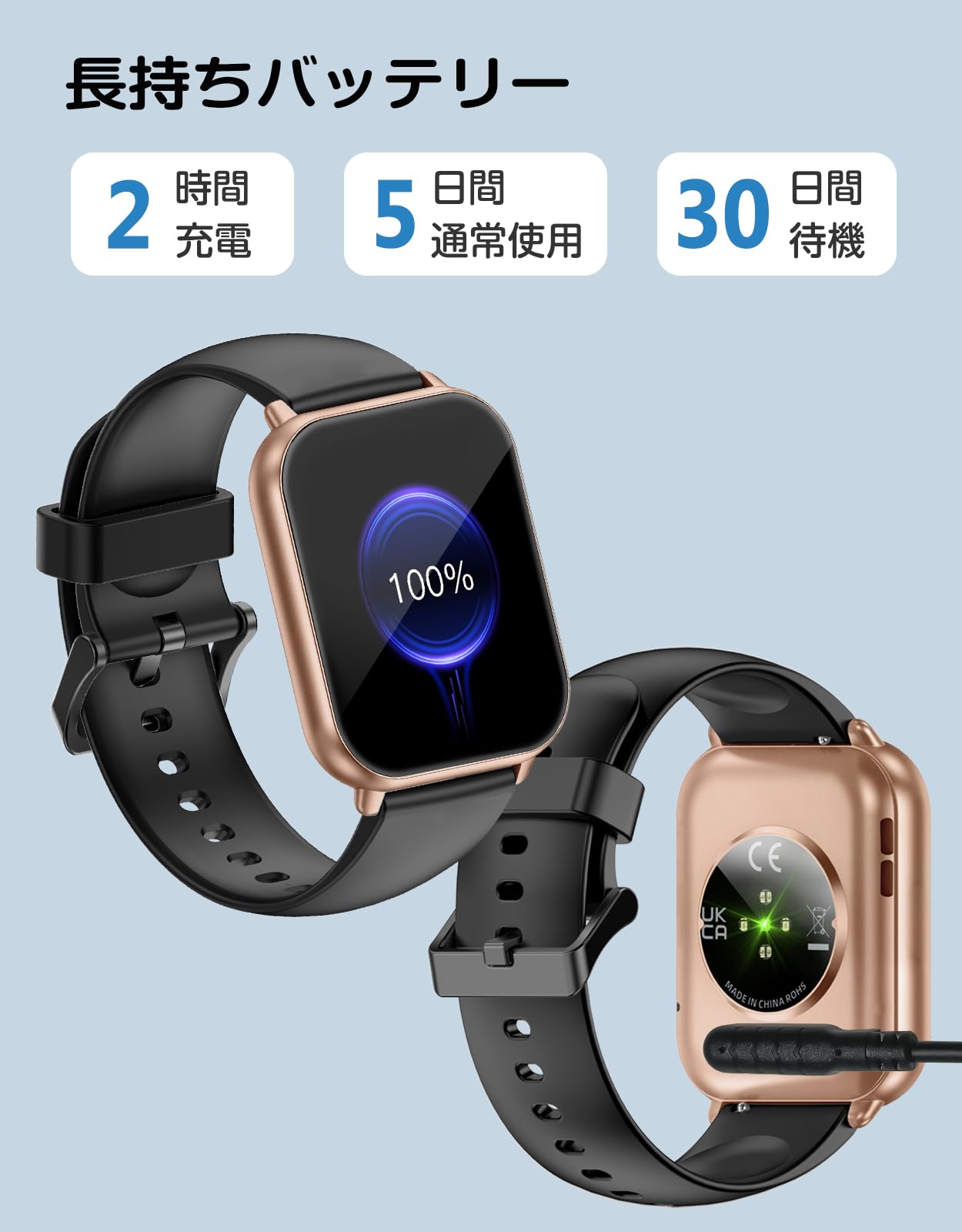 * 【多種類運動モード&長持ちバッテリー】 活動量計には、ランニング、ウォーキング、サイクリング、サッカー、バスケットボール、水泳、ヨガ、ハイキングなど20種類のデフォルトのスポーツモードがあり、21番目のスポーツモードはアプリでプッシュでき、100以上のスポーツモードがアプリで利用でき、毎日のスポーツニーズに応えることができ、それだけでなく、ユーザーの歩数、距離などを正確に記録します。大容量バッテリーを搭載され、一回のフル充電で約5~7日間持続するバッテリーも魅力です。待機時間は約30日間となります。付属の磁気充電ケーブルをスマートウォッチの充電端子に接続すると充電開始となります(個人の利用状況によっては、持続可能な利用時間が異なります)