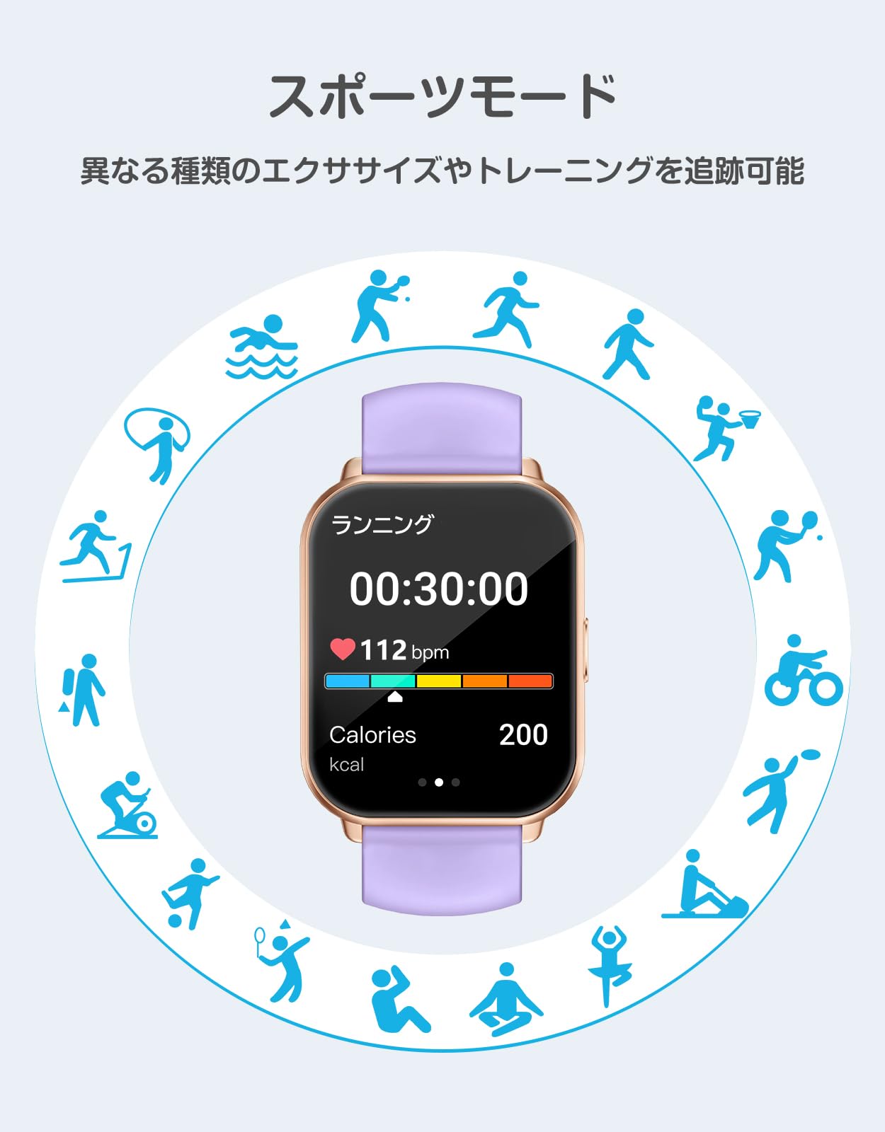 * 【100+種類スポーツ機能・活動量計】 100種類以上のスポーツモード:ランニング、ヨガ、水泳、登山、徒歩、テニス、サッカー、バレーボール、ダンス、腹筋、ハイキング、卓球、野球などを搭載、運動中のデータを記録し、いつでも運動状況を把握することができます。また、毎日の歩数や歩いた距離も記録されるので、目標値を設定することができます。毎日の運動量を正確に把握することができます、運動不足解消や運動好きな方におすすめです。