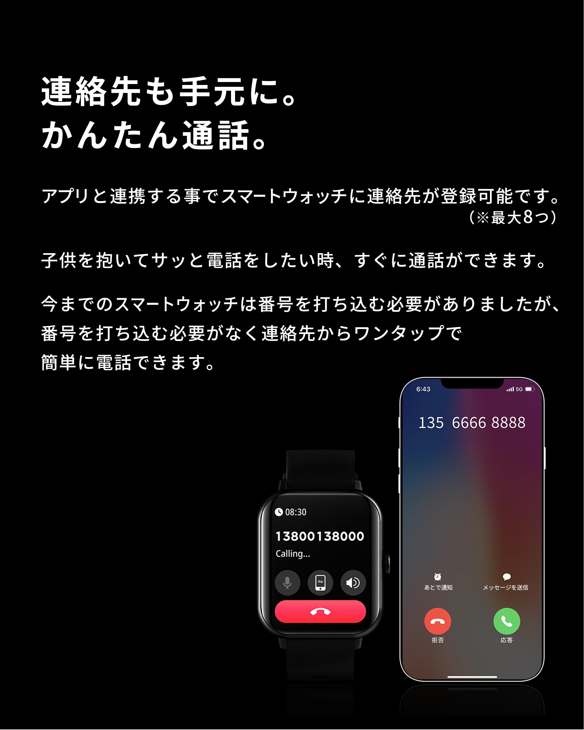 * 【連絡先も手元に。かんたん通話】アプリと連携する事でスマートウォッチに連絡先が登録可能です(※最大8つ)。子供を抱いてサッと電話をしたい時、すぐに通話ができます。今までのスマートウォッチは番号を打ち込む必要がありましたが、番号を打ち込む必要がなく連絡先からワンタップで簡単に電話も可能です。また、Bluetoothを通じて着信やメーセージ内容を表示します。LINE含む各種SNSの日本語対応済。メッセージ以外の通知もしてくれます。(スタンドリマインダー/飲水通知)【対応済みアプリ】 着信/SMS/Line/Facebook/Twitter/WhatsApp/WeChat/Instagram/Skype/KakaoTalk