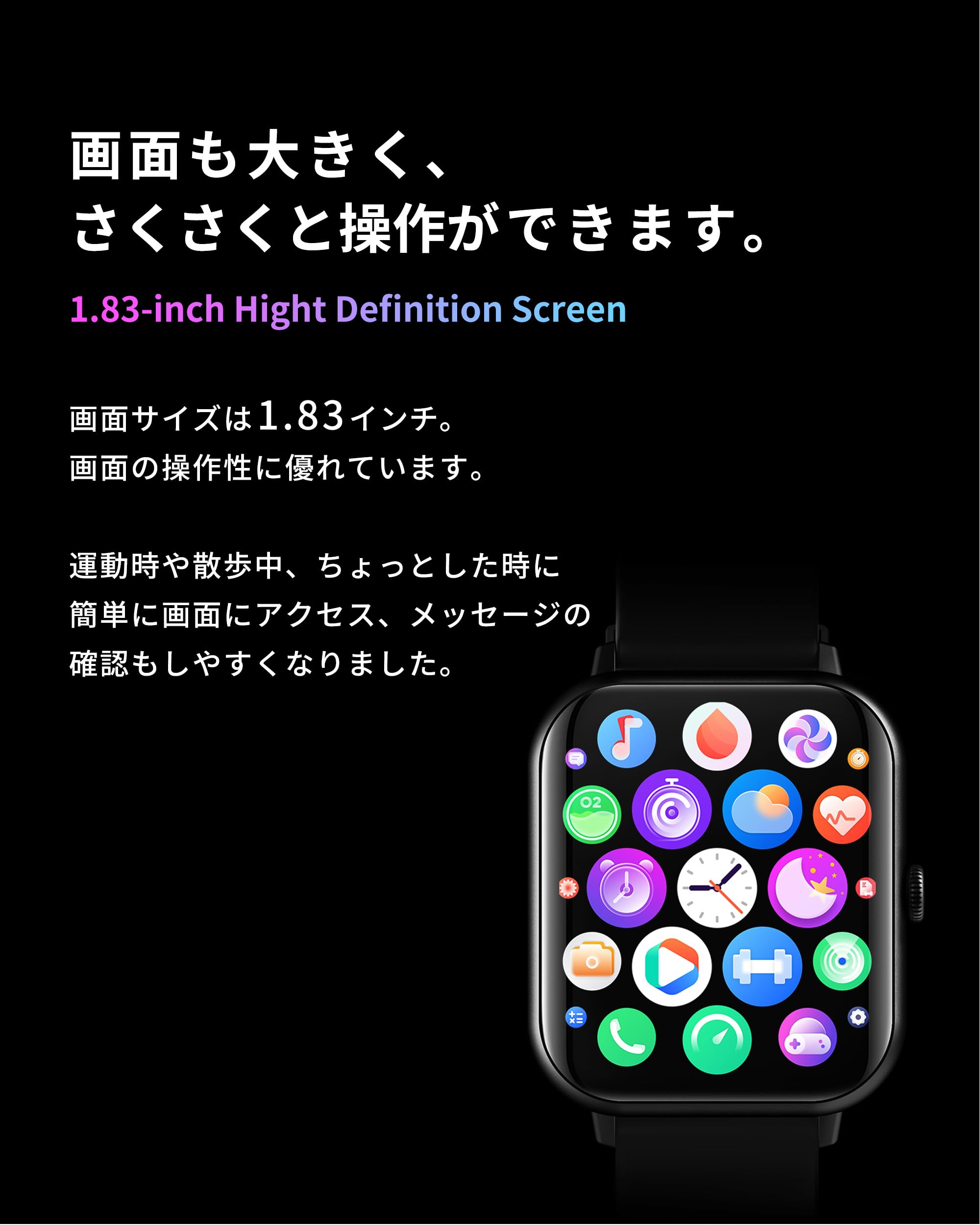 * 【今日の服装に合う壁紙をAIに作ってもらおう】100以上のデフォルトの壁紙に加え、自分の好きな写真も壁紙にできます。また、スマホで今日の服装を撮影すればAIがあなたの服装に合わせたオリジナルの文字盤を作成してくれます。弊社インスタグラムで配布中のオリジナル壁紙もQRコードでダウンロードが可能画面サイズは1.83インチ。画面の操作性に優れています。運動時や散歩中、ちょっとした時に簡単に画面にアクセス、メッセージの確認もしやすくなりました。