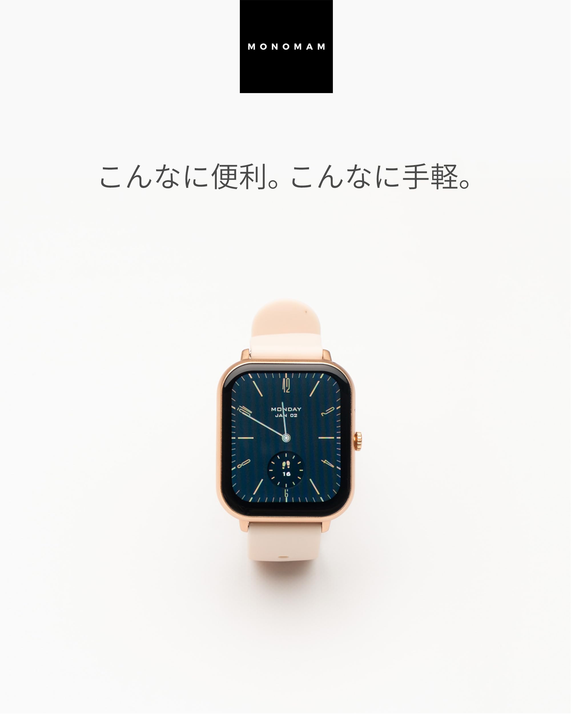 * 【くすみカラーを取り入れたクラシックな1台】スマートウォッチが登場した初期から販売してきた日本企業からこそ、汲み取れる"本来のニーズ"。クラシックなサイズ、デザインを基調に必要な機能を詰め込みました。今まで頂いたお声を元にバンドのカラーをよりファッショナブルに。機能だけじゃない、カジュアルに楽しめるそんな1台が「MONOMAM」から登場しました。待望のエントリーモデルです。