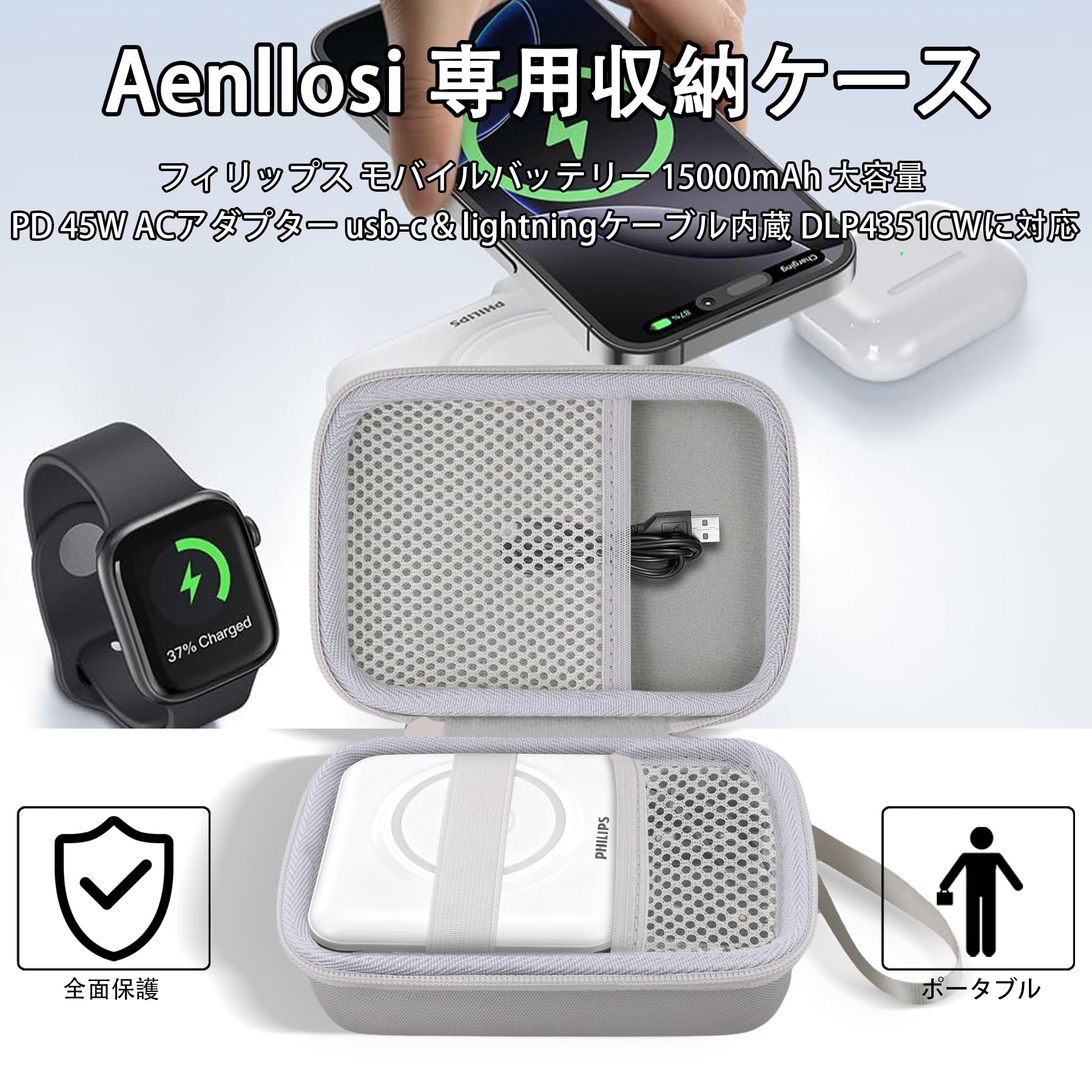 (ケースのみ)Philips フィリップス モバイルバッテリー 15000mAh 大容量 PD 45W ACアダプター usb-c & lightningケーブル内蔵 Apple Watch対応 MagSafe 2.5W マグネット式 ワイヤレス充電器DLP4351CW収納ケース,オフホワイト-Aenllosi