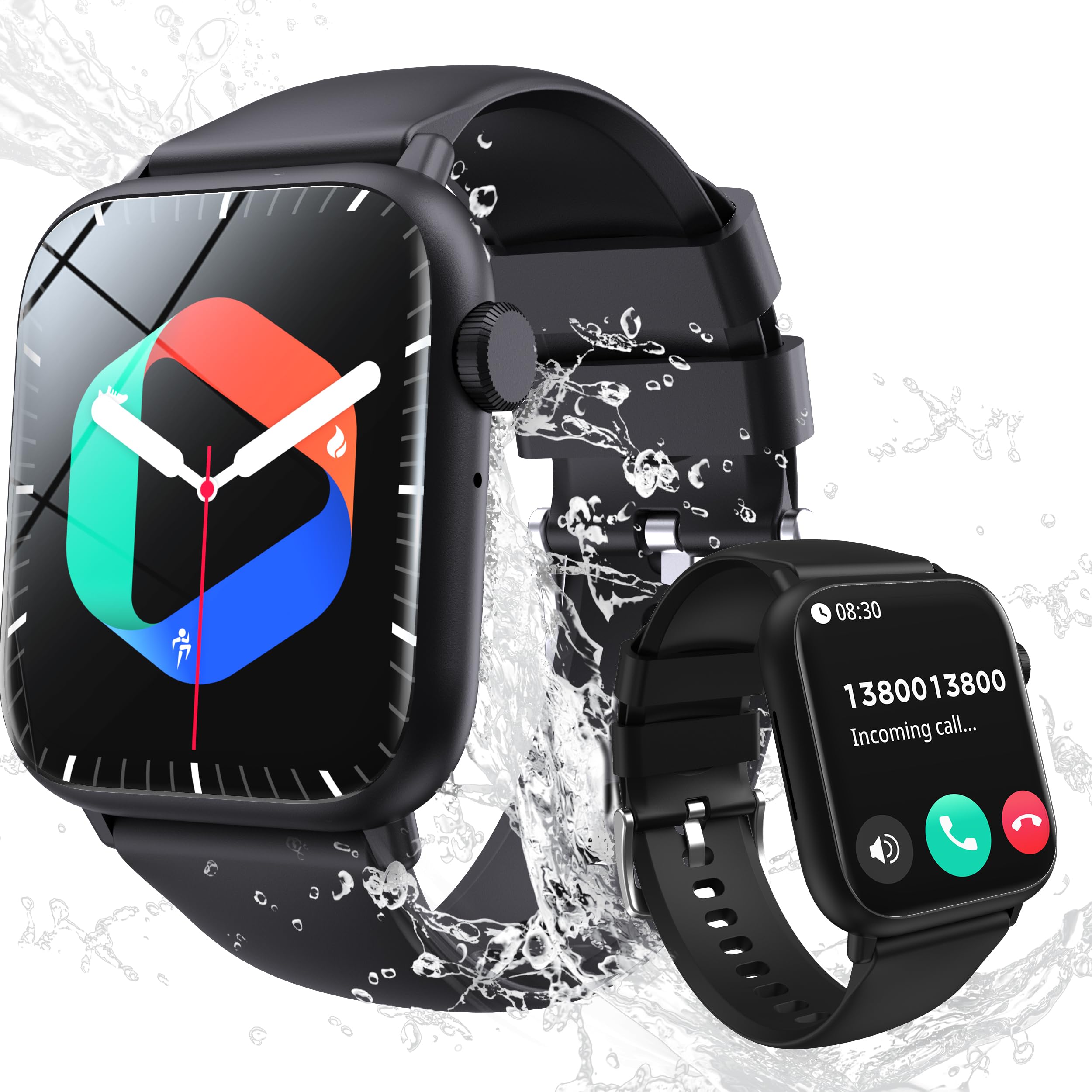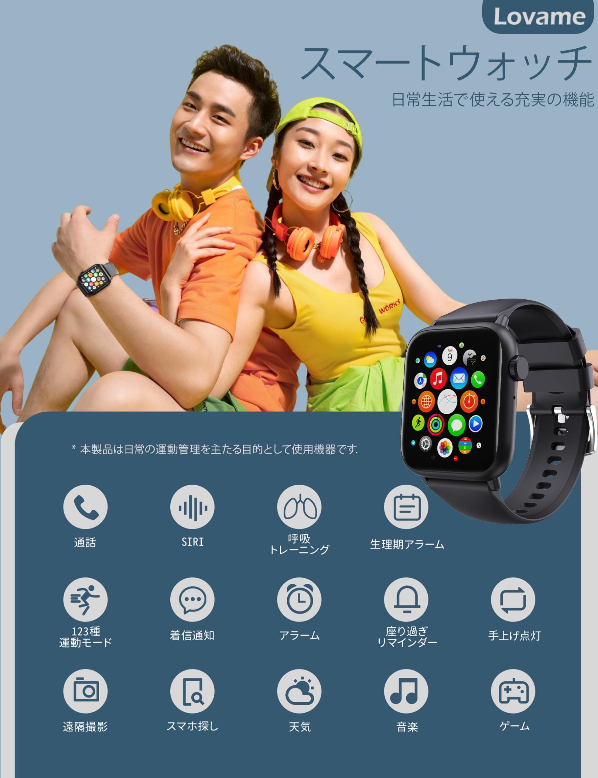 * 【100多種類な運動モード&実用な機能満載】スポーツウォッチはウォーキング、ランニング、サイクリング、登山、サッカー、ヨガなど、さまざまなスポーツモードがあります。多種類スポーツ組み込み、消費カロリー、運動データ、歩数計、活動量計、距離などを記録して、運動計画の達成に役に立ちます、自分の状態を十分に把握します。走行距離と消費カロリーはもちろん、アプリでライニング時間を設定でき、組み合わせたGPS機能で働作を記録し、運動軌跡などが一目瞭然です。また、着信通知/拒否/通話、輝度調整、天気予報、活動量計、歩数計、長座注意、SOS緊急通話、GPS、スマートウォッチ探し、バイブレーション強度調整、目覚まし時計、カメラ制御、音楽制御/再生など実用な機能が備えます。
