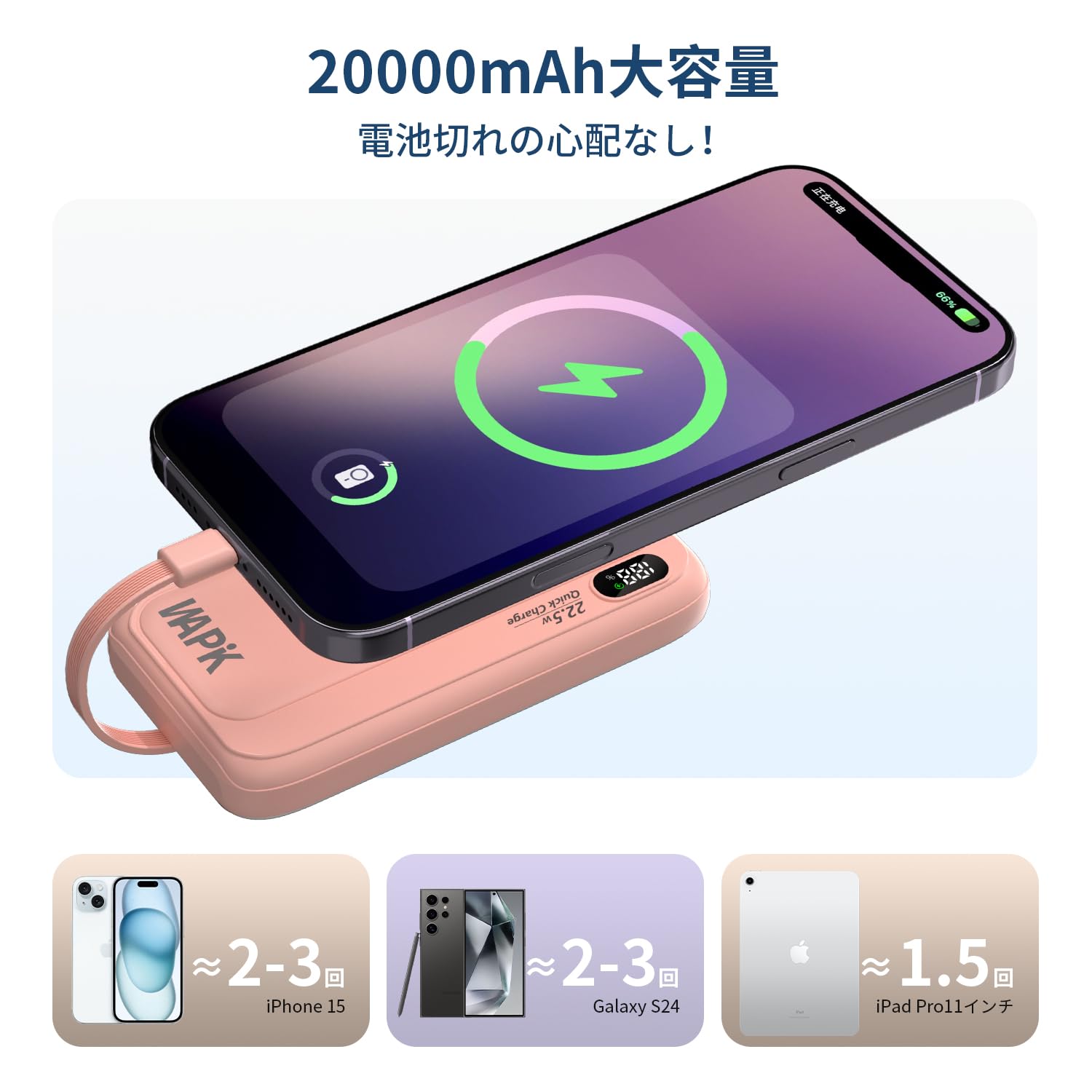 モバイルバッテリー 大容量 20000mAh 22.5w急速充電 ケーブル内蔵 LED残量 持ち運び便利 スマホ 充電器 iPhone/Android 対応 軽量 PSE認証済み 機内持ち込み可 旅行 出張 地震対策 防災 停電 (ピンク)
