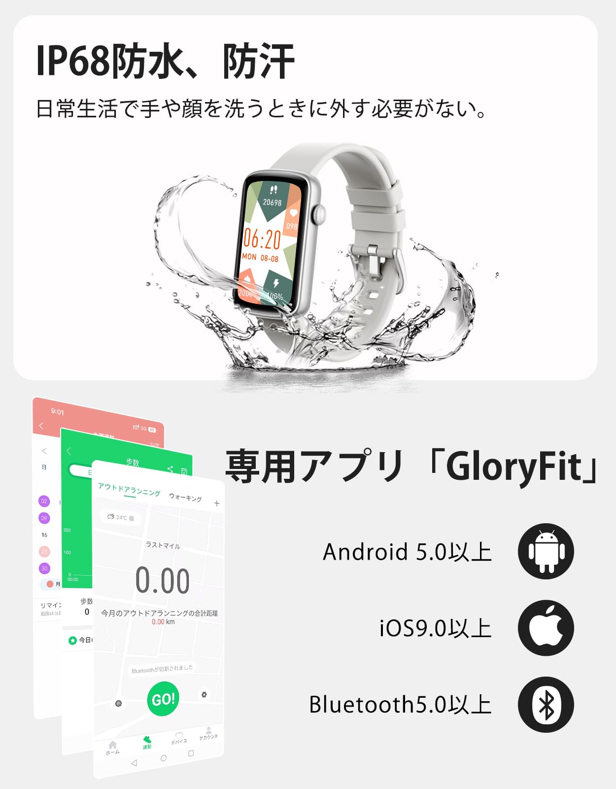 * 「1.47インチ·超軽量·使いやすい」スマートウォッチL2は、1.47インチの長方形のスクリーンを搭載し、解像度は170×320で、文字がクリアで読みやすくなっています。男女兼用で、バンドを含めた重量はわずか28.5gで、一日中付けていても違和感を感じません。タッチスクリーン操作で、アプリ「GloryFit」に接続すれば、簡単に使うことができます。また、このスマートウォッチは、多様なシーンで活躍できます。スポーツ時には運動データを記録し、日常生活管理に役立ちます。ビジネス時には、通知を受け取ったり、スケジュールを管理したりすることができます。さらに、レジャー時には、音楽コントロールや写真撮影のリモート操作が可能です。このように、様々な場面で活用できるスマートウォッチです。