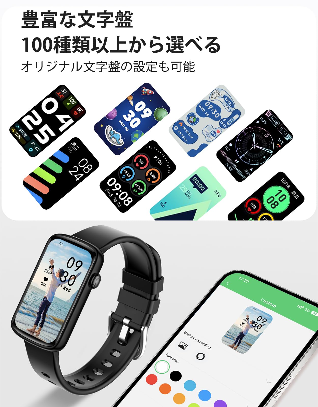 * 「100+文字盤·座りすぎ通知·生理周期」スマートウォッチ本体に5つの文字盤を搭載。専用アプリで100以上の文字盤をダウンロードできるだけでなく、アルバムや撮影により、お気に入りの写真を文字盤に設定することもでき、毎日気分に合わせたスタイルを楽しめます!専用アプリで座り過ぎのリマインダーの時間帯や間隔を自由に設定し、日常生活に無理なく取り入れられます。体を動かすタイミングを見逃しません。さらに、女性の生理周期を記録する機能では、アプリで生理周期の開始日と終了日を記録することで、次回の予想月経日や排卵日などを予測することができます。