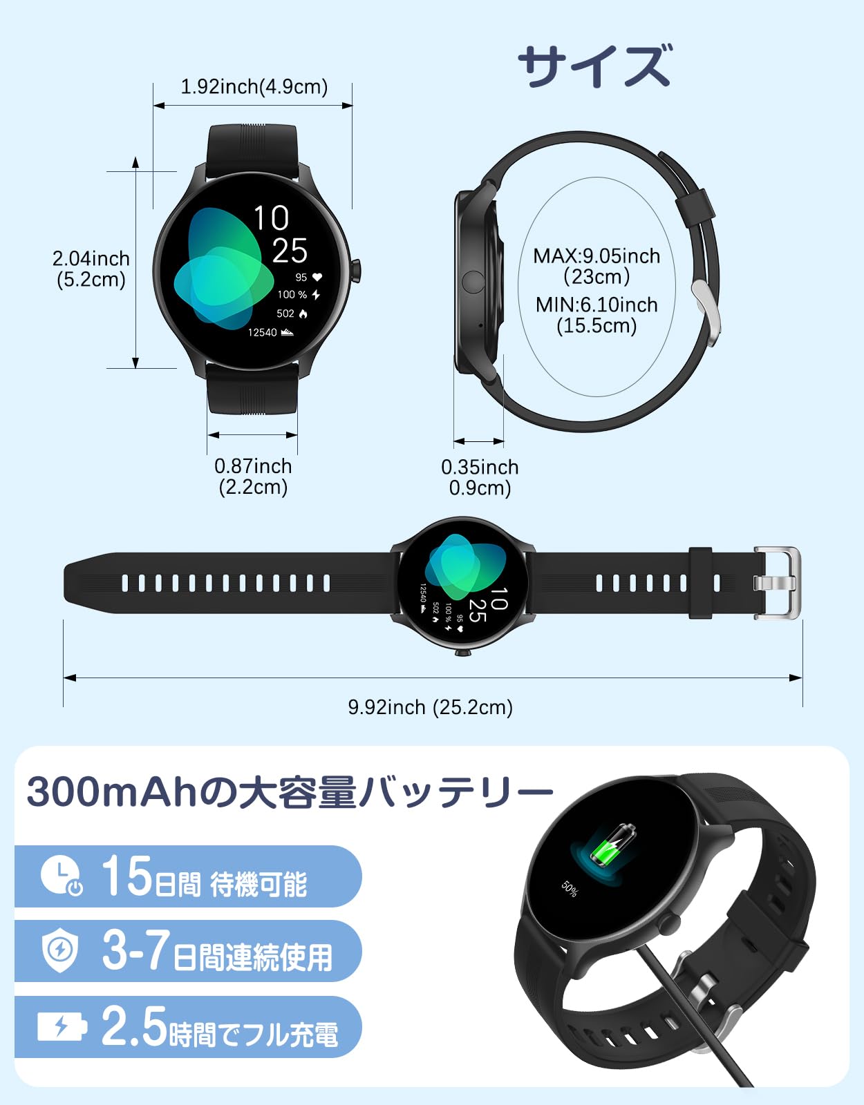 * 【大容量電池・TELEC認証済み】内蔵300mAhの大容量電池で、2.5時間でフル充電でき、3~7日間使用可能で、待機時間は約15日間です。注:電子製品の消費電力は使用頻度によって異なりますので、事前にご了承ください。 なお、HUAKUA Smartwatch H2はTELEC認証を取得しており、電波法の規定に準拠した製品です。
