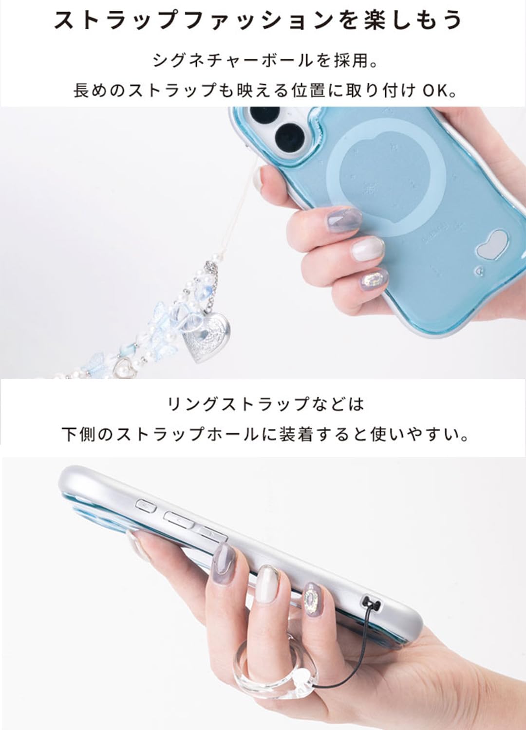 * 「BeBling」は、iFaceから登場した新シリーズ。「BeBling 2」では、「Frutiger Aero」をコンセプトに、2010年前後のUIトレンドから着想を得た“テクノロジーと自然の歪な融合”をテーマとしたデザインを展開します。カラーは、コンセプトを最も感じられるブルーに加え、クリアとブラックの全3色。どんなコーディネートにも合わせやすく、同時にトレンド感も演出します。自由に組み合わせて、あなたの個性をもっと輝かせて。同じBeBling 2 シリーズのアイテムを組み合わせることで、より一層その世界観を楽しめます。「テクノロジーと自然の歪な融合」をテーマに、テック感のあるシルバーカラーのベースに、水の流れをイメージした凹凸のあるクリア素材を合わせたデザインケース。