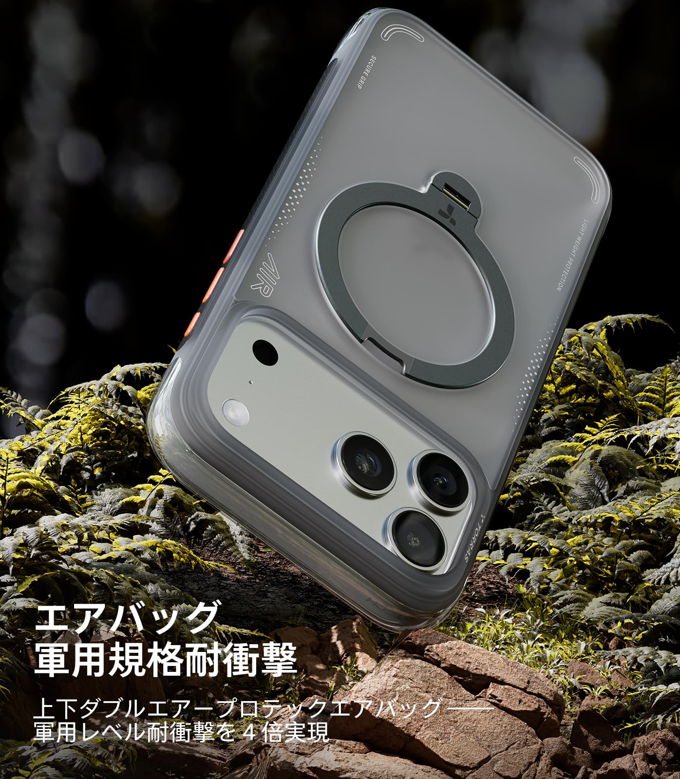 * 【見える最強防御!Airバッグ搭載】世界初のエアバッグ技術を搭載、業界初のエアダイナミック緩衝構造を搭載 —100% 空気力学構造が落下・衝突・摩擦を瞬時に分散吸収!米軍規格 4m耐落下防護性。4m 高さから 100 回落下しても亀裂を生じにくい。-20℃~60℃の温度変化や湿度 95% 環境下でも材質劣化せず。満員電車でバッグから滑落、デスクワーク中のうっかり滑り、登山時の岩場での手滑り、クライミング中の装備からの脱落、山道ハイキングでのポケットからの飛び出し、ランニング時の振動での落下、サイクリング中の激しい振動… どんなアクシデントでも、フチを1.44mm わずかに高く設計。 特にアウトドアでの使用時は、石や地面との接触による衝撃もしっかり吸収し、冒険中も安心してスマホを使える。更に、ケース本体はアップグレードし、従来モデルより 6g 軽量化を実現した —— 高い防護性能を維持しつつ、持ち運びやスマホの操作性も向上する。目で見える全方位保護で、いつも安心感をパックしている。対応機種:iPhone 17 Pro Max 6.9 インチ用