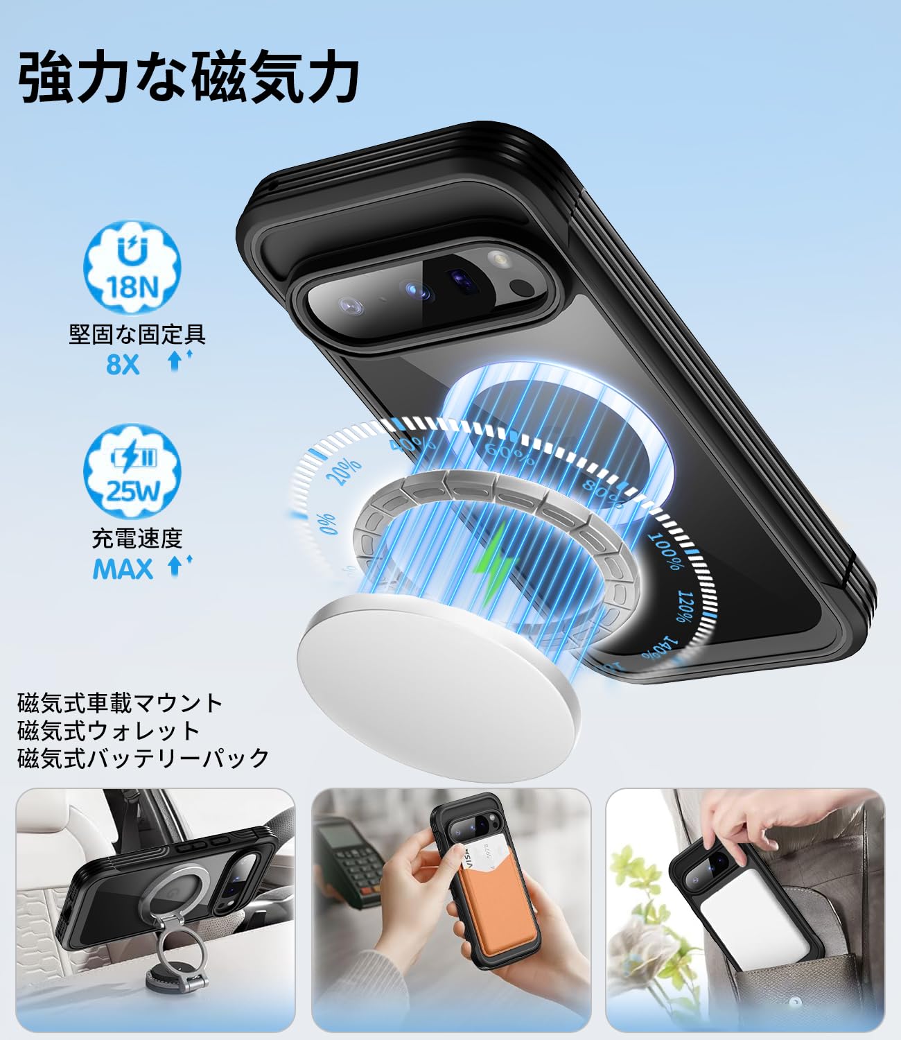 * 【磁気魔法の不思議-25W高速充電】このPixel 10/10pro用スタンド保護ケースは、すべてのMagSafeアクセサリーとの完璧な組み合わせです。揺れを心配する必要はありません——磁気吸着式ウォレットはスマートフォンにしっかりと吸着します。48個の磁石リング構造を内蔵し、MagResonanceアレイ技術で配置された磁気吸着力は公式バージョン比で2倍の強度を誇り、高速かつ安全なワイヤレス充電に対応しています。スマートフォンをどのように回転させても、MagSafeアクセサリーにしっかり吸着し、外れることはありません。吸着力だけでなく、強い磁気でMagsafeの充電時間を短縮することもでき、バッテリーの延命につながる。これはMagSafeテクノロジーを活用する最適の選択だ。いくら振っても落ないので、充電しながらゲームをやっても便利!また、ワイヤレス充電や各種MagSafe対応アクセサリーにもばっちり対応しています。