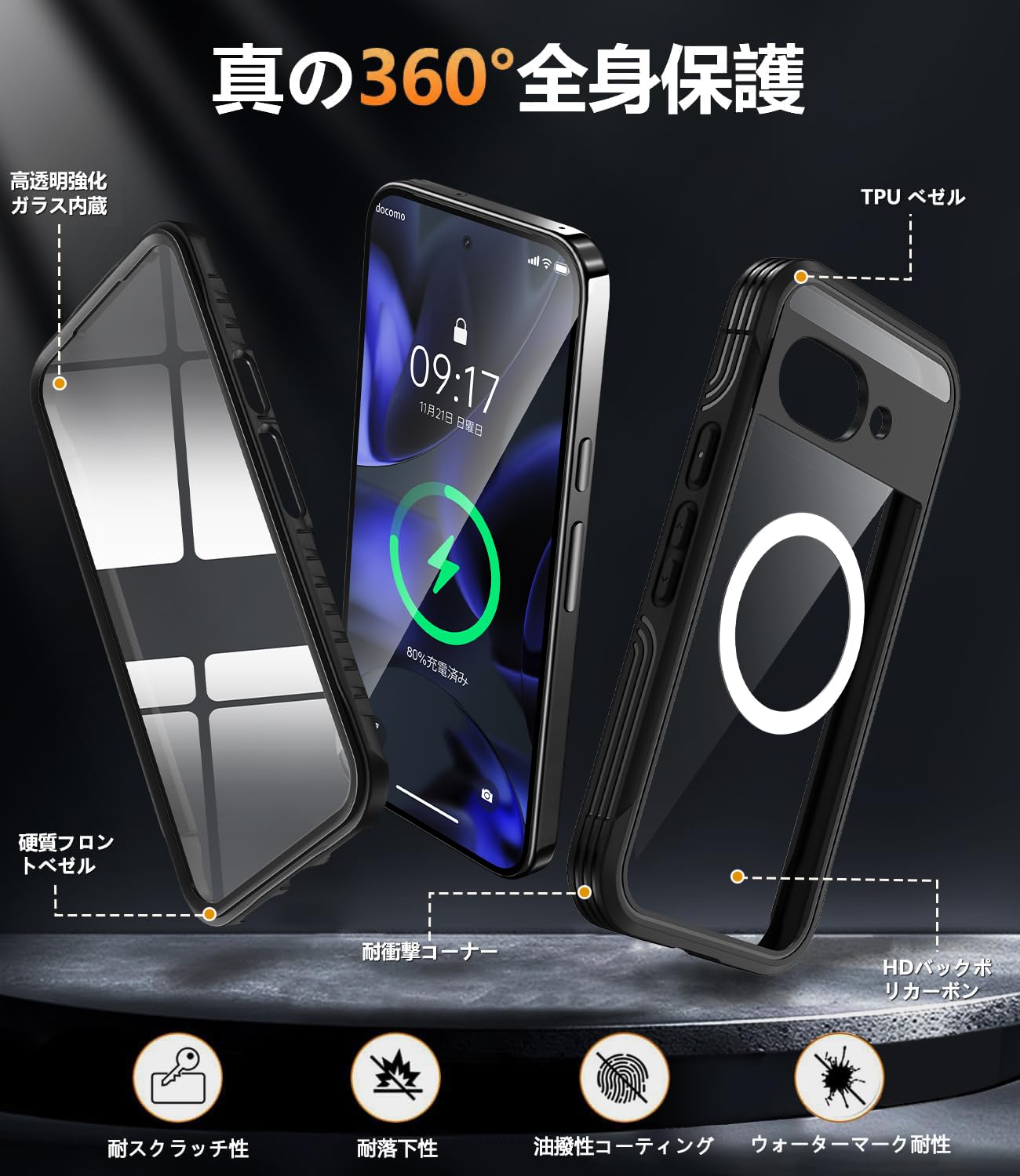 * 【9H高精細耐傷スクリーン & パチッと両面装着、簡単!】このPixel 9 Aフルボディケースは、強化ガラスフィルムを追加する必要がなく、気泡やズレなどの問題を心配する必要もない、最小限の取り付けで済むように作られています。高精細な強化ガラスのフロントカバーは、スクリーンを傷から守るだけでなく、タッチ操作に素早く反応し、耐油性、耐水性に優れ、手触りも快適です。このケースは、二重構造のガラスと複合素材でデザインされています。フロントカバーとリアカバーが360°全身を保護。 4隅のエアバッグによる衝撃保護と4層のTPUソフトバンパーの組み合わせにより、衝撃を最大限に分散。高低差のデザインで、日常生活でカメラや画面への擦り傷を防ぎます。Pixel 9 Aを全方位からしっかりと守ります。注意:画面保護フィルムを貼ってる必要はありません、操作反応が低下します。