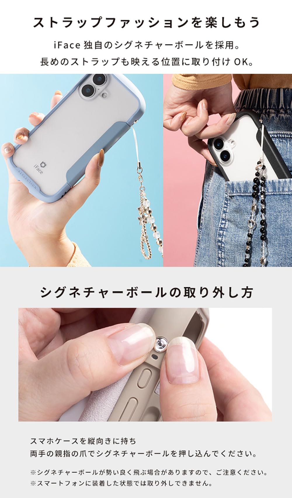* 【手帳型×クリアのハイブリッドケース】iFaceの大人気シリーズReflectionの手帳型ケース。手帳型の機能性を保ちつつ、ステッカーや写真が入れられるクリア背面で、自分好みのカスタマイズが楽しめます。シグネチャーボール搭載でストラップの付け方アレンジが今まで以上に広がります。