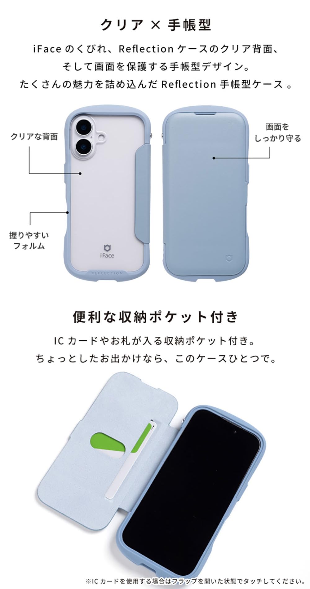 * 【手帳型×クリアのハイブリッドケース】iFaceの大人気シリーズReflectionの手帳型ケース。手帳型の機能性を保ちつつ、ステッカーや写真が入れられるクリア背面で、自分好みのカスタマイズが楽しめます。シグネチャーボール搭載でストラップの付け方アレンジが今まで以上に広がります。