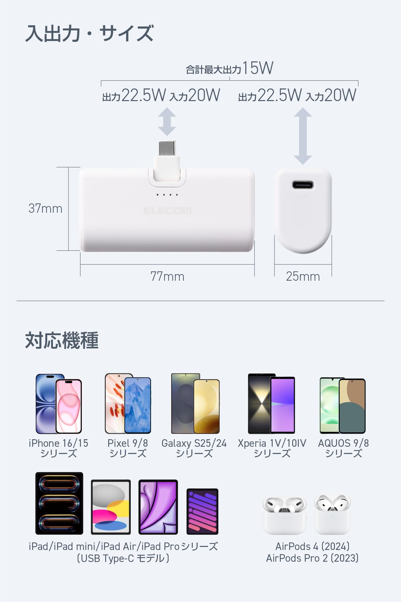 エレコム モバイルバッテリー 5000mAh 22.5W 軽量 小型 タイプC 直挿し USB-C一体型 スイング式コネクタ ケーブルいらずで挿すだけ充電 【 iPhone16/iPad 第10世代/Google Pixel9 対応】 ホワイト EC-C28LWH
