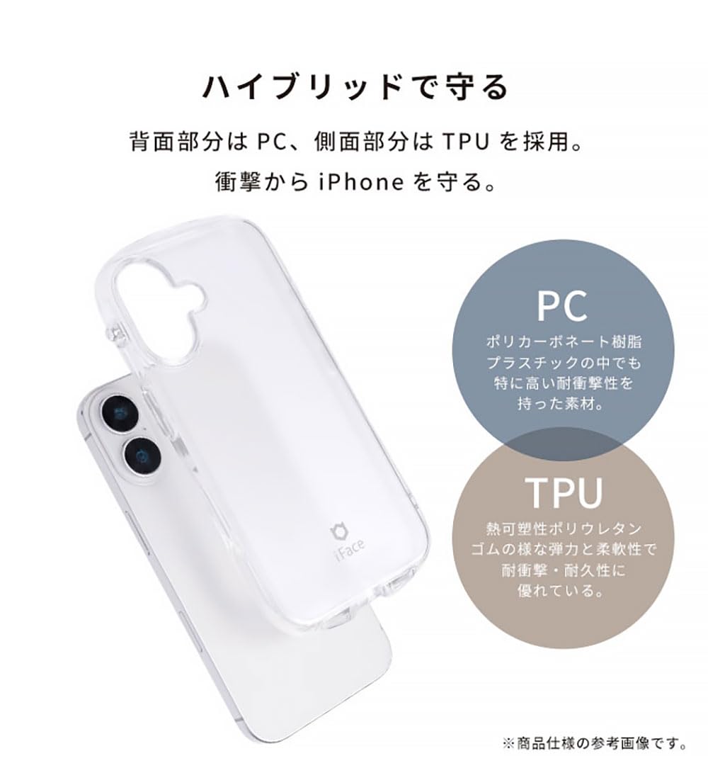* 背面は指紋跡がのこりにくいサラサラしたマットタイプ / クリアな背面に、シールや写真を入れてカスタマイズが可能 / 手にしっかりフィットする「くびれ」形状で持ちやすさ抜群 / 弾力のあるTPUで、端末をしっかり保護 / 画面とカメラを守る、フチ高設計 / 側面のドット加工で密着痕を防ぎ、見た目を美しく保つ / ケースを装着したまま、サイドボタンやカメラ機能の操作がスムーズに行えます / 選べる2カ所のストラップホール / iFaceストラップホルダー専用設計でショルダーストラップの使いやすさアップ ※ストラップホルダーを併用する場合は、iFaceから発売している製品をご使用ください。類似品ではiFaceケースと併用の使用感を保証しかねるため、ご注意ください。 / iFaceスマホリング、iFace画面保護シートとの併用も可能 ※iFaceスマホリングと併用する際には一日ほど置くとしっかり貼り付きます。