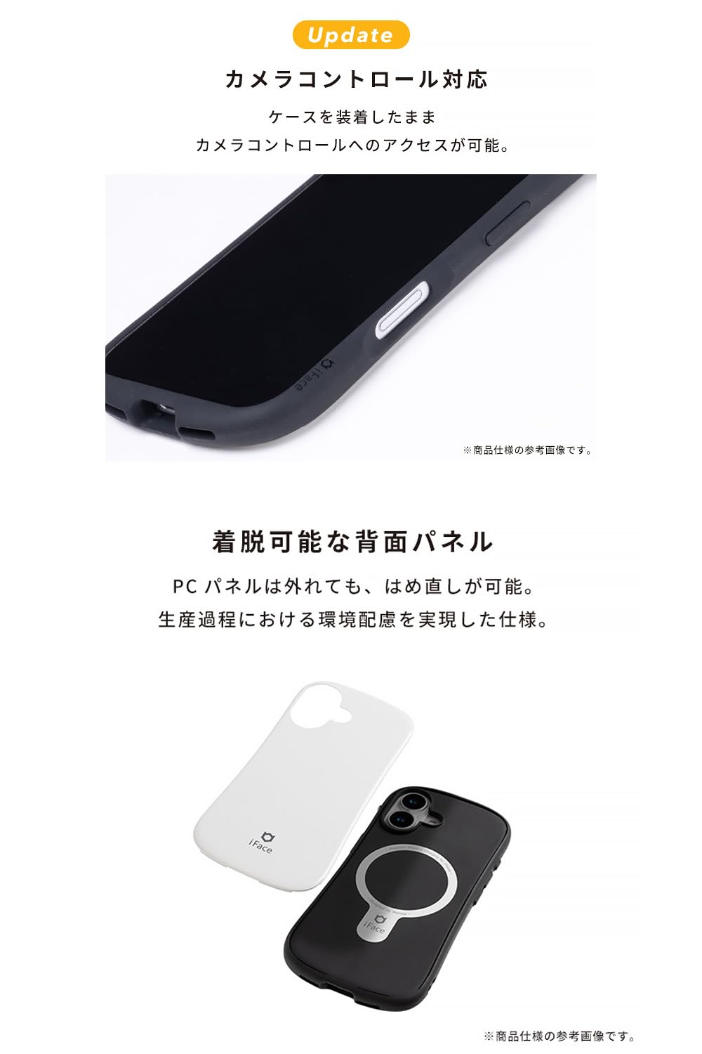* 手にしっかりフィットする「くびれ」形状で持ちやすさ抜群 / ポリカーボネートとTPU、2つの素材で端末をしっかり保護 / 画面とカメラを守るフチ高設計 / ケースを付けたままでも操作感を損なわないサイドボタン / サイドホールもしっかり対応。カメラコントロールへのアクセスもスムーズに / ケースをつけたままMagSafe充電に対応 / 着脱可能な背面PCパネル設計。生産過程における環境配慮を実現した仕様に / 選べる2カ所のストラップホール / シグネチャーボール搭載でストラップの付け方が広がる / iFaceストラップホルダー専用設計でショルダーストラップの使いやすさアップ ※ストラップホルダーを併用する場合は、iFaceから発売している製品をご使用ください。類似品ではiFaceケースと併用の使用感を保証しかねるため、ご注意ください。