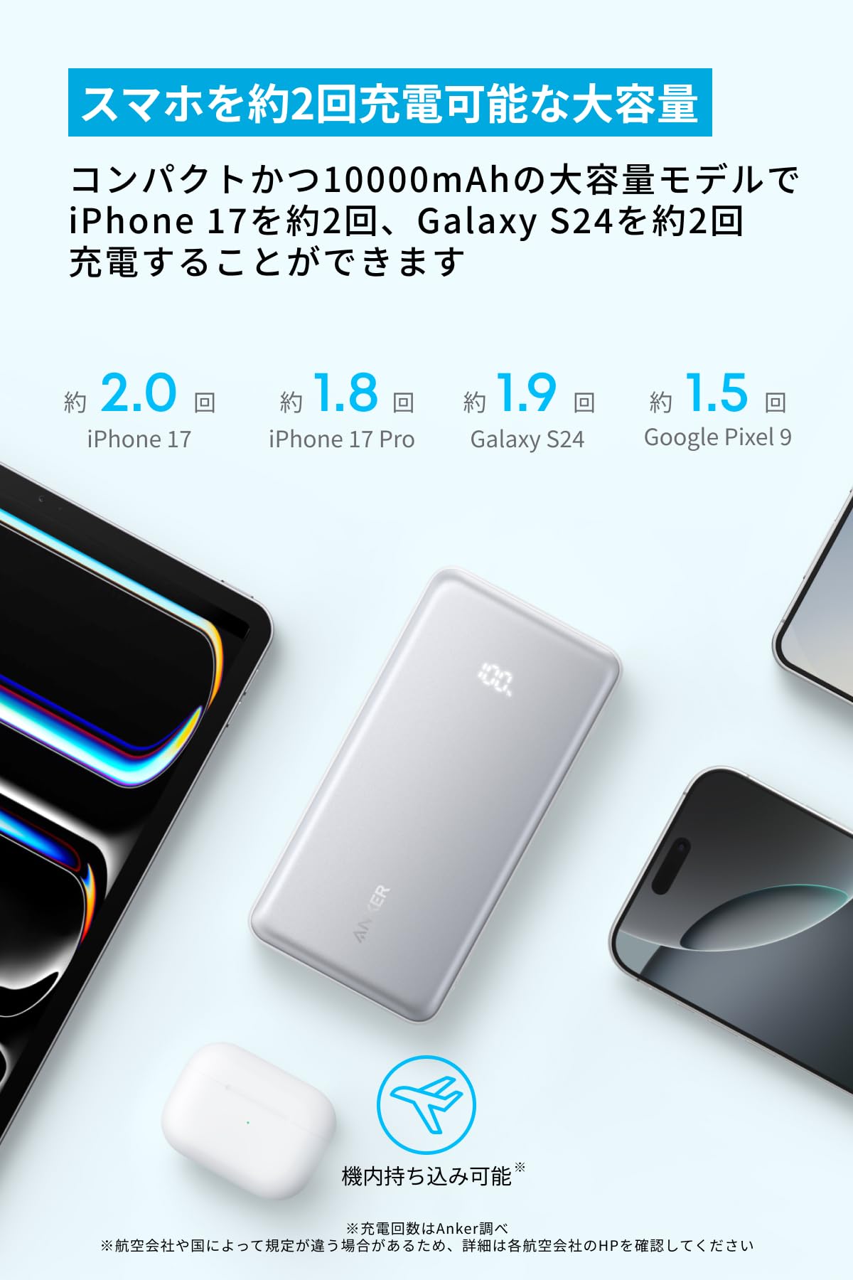 * コンパクトサイズかつ安心の大容量:コンパクトサイズに10000mAhの大容量を備え、iPhone 16を約2回、Samsung S24を約2回充電することができます。