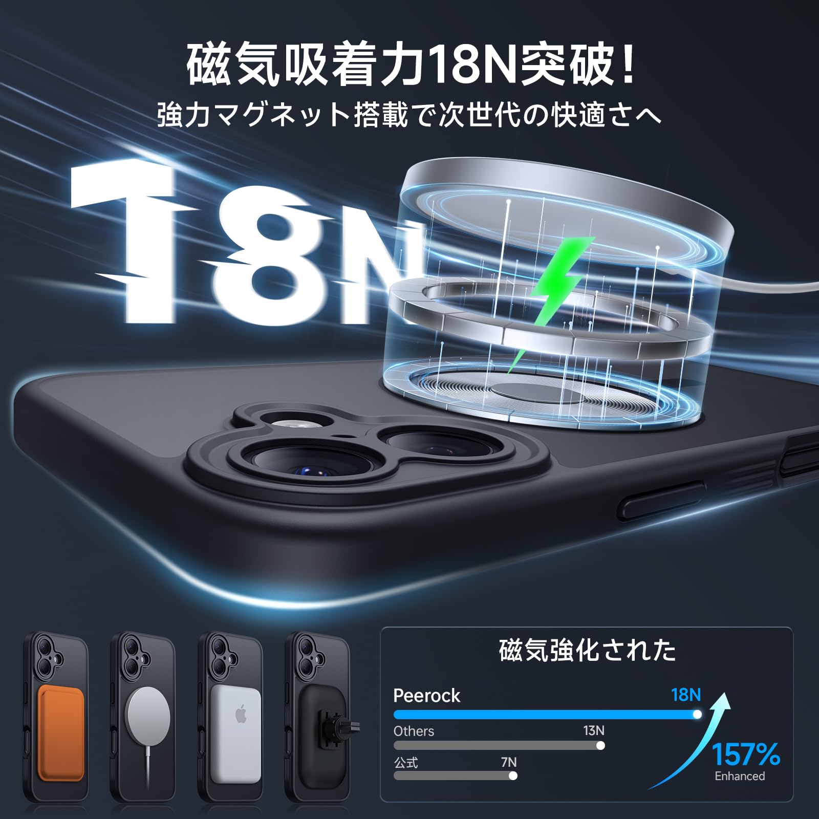 【最強レンズ保護・高精度MagSafe対応】Peerock iPhone 17 用ケース 精密カメラホール保護 滑り止め 半透明マット 米軍規格 耐衝撃 超強磁力 ワイヤレス充電対応 マグネット内蔵 黄ばみなし 落下防止 つや消し仕上げ さらさら手触り いphone17 用ケース 6.3インチ (ブラック)