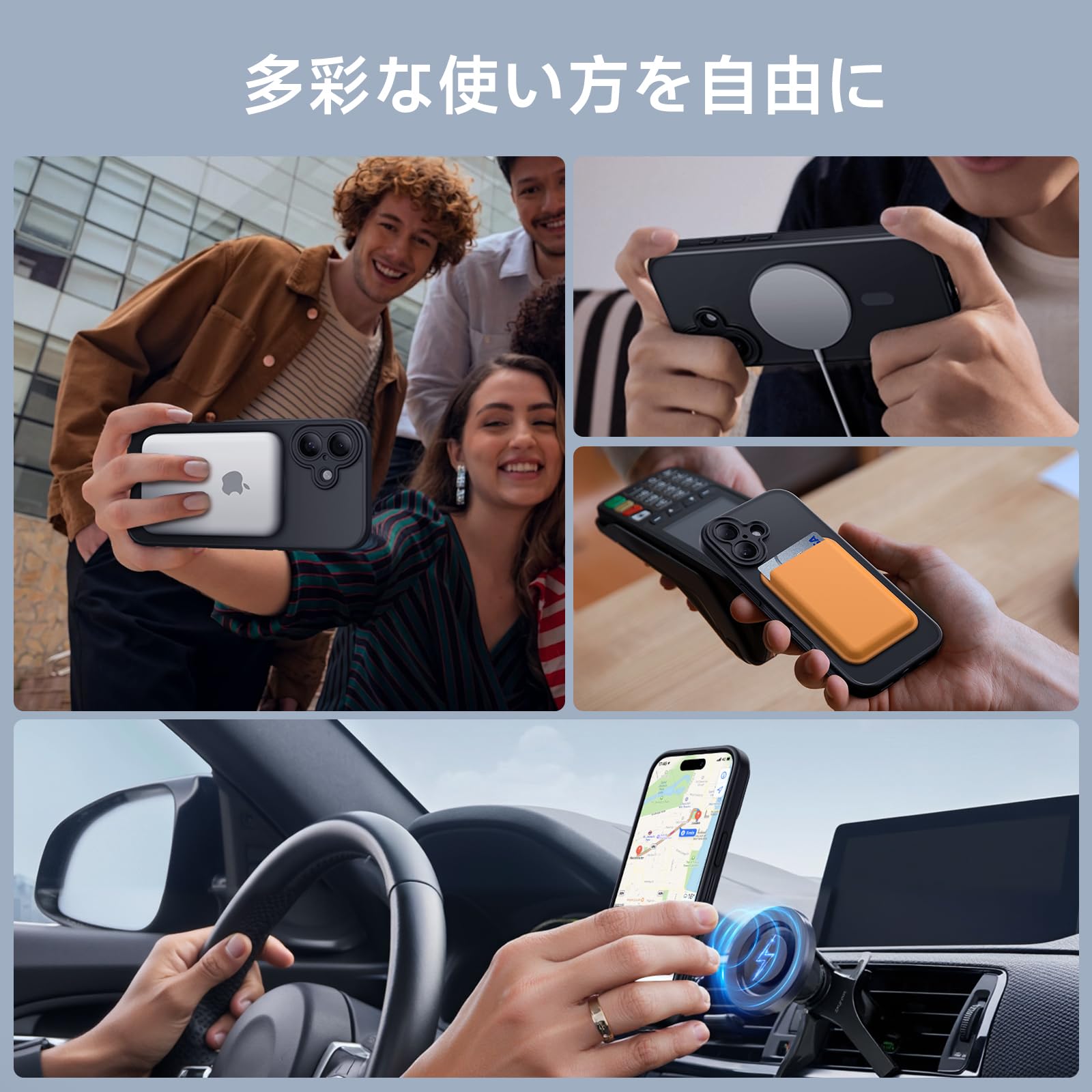 * 【精密1:1吸着設計・ズレ心配なし】MagSafe規格に基づく1:1精密レイアウトで、角度を変えてもズレや脱落をしっかり防止。ケース装着時や充電中でも吸着力が落ちず、片手でラクラク吸着できます。車載ホルダーにセットすれば、走行中の揺れや振動でも安定し、ナビ操作や音楽再生も安心。通勤・移動中はもちろん、自宅やオフィスの机上でも快適に使用可能です。対応機種:いphone17 ケース magsafe