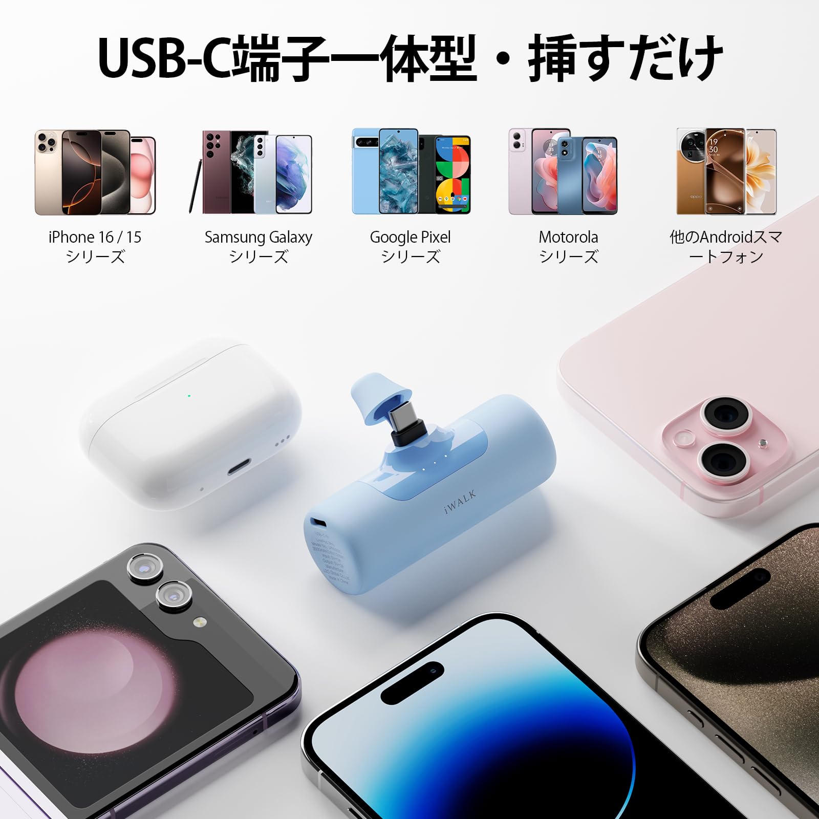 iWALK モバイルバッテリー 極小化 【USB-C端子一体型・iWALK 最小サイズ登場】 軽量 小型 4500mAh 急速充電 モバイル バッテリー タイプc アイウォーク type c コネクター内蔵 コードレス パススルー機能 残量インジケーター付き 可愛い 持ち運び便利 iPhone/AirPods/Android対応 「iPhone 17/16/15シリーズ対応」PSE認証済 ブルー