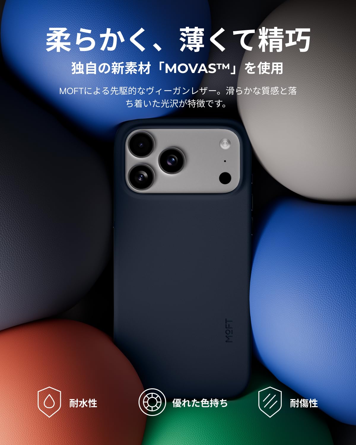 * 【MOVASの美しさ・柔らかな手触り】MOFT独自開発の「MOVAS」ヴィーガンレザーは、環境に優しい最新技術を採用し、肌になじむ柔らかな質感や究極の握り心地を満喫できます。 この素材は軽量で持ち運びやすく、美しさが長持ちし、長時間に使用しても上品な光沢を保ちます。ジーンズのポケットに入れても、鍵やカードキーなどと一緒に持ち歩いても、傷がつきにくいです。MOVASレザーケースは実用的なケースであるだけでなく、機能性を保ちながらiPhoneに洗練された感覚を加えるファッションのアイテムでもあります。