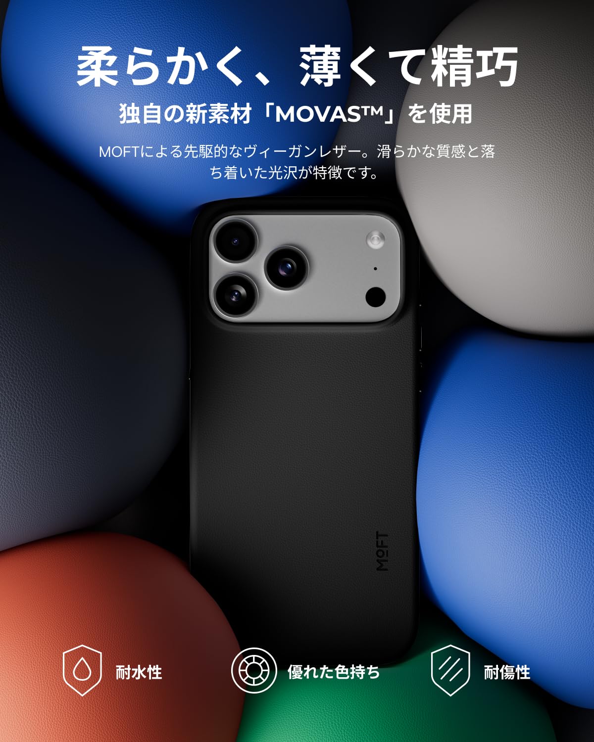* 【MOVASの美しさ・柔らかな手触り】MOFT独自開発の「MOVAS」ヴィーガンレザーは、環境に優しい最新技術を採用し、肌になじむ柔らかな質感や究極の握り心地を満喫できます。 この素材は軽量で持ち運びやすく、美しさが長持ちし、長時間に使用しても上品な光沢を保ちます。ジーンズのポケットに入れても、鍵やカードキーなどと一緒に持ち歩いても、傷がつきにくいです。MOVASレザーケースは実用的なケースであるだけでなく、機能性を保ちながらiPhoneに洗練された感覚を加えるファッションのアイテムでもあります。m