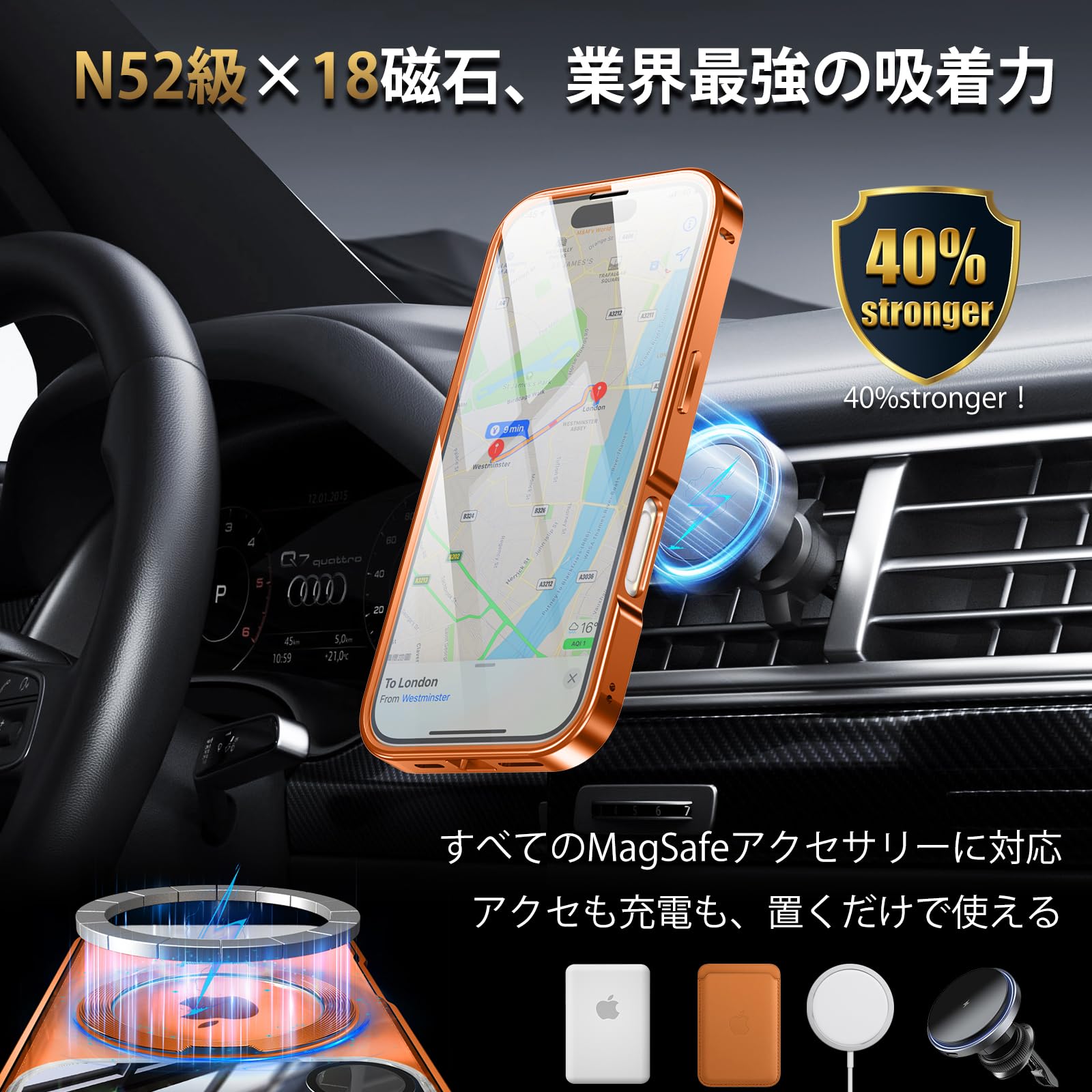 iPhone 17 Pro 用 両面 MagSafe対応 ケース アイフォン17プロ フルカバー 【90°確実に自立 × 360°回転】 ゼンマイ式スタンド 縦横多角度 Uovon スマホケース アイホン17プロ 全面保護 カバー ガラス CD紋リングスタンド ワイヤレス充電 車載ホルダー ロック機能 金属ボタン カメラレンズ保護 ・ オレンジ