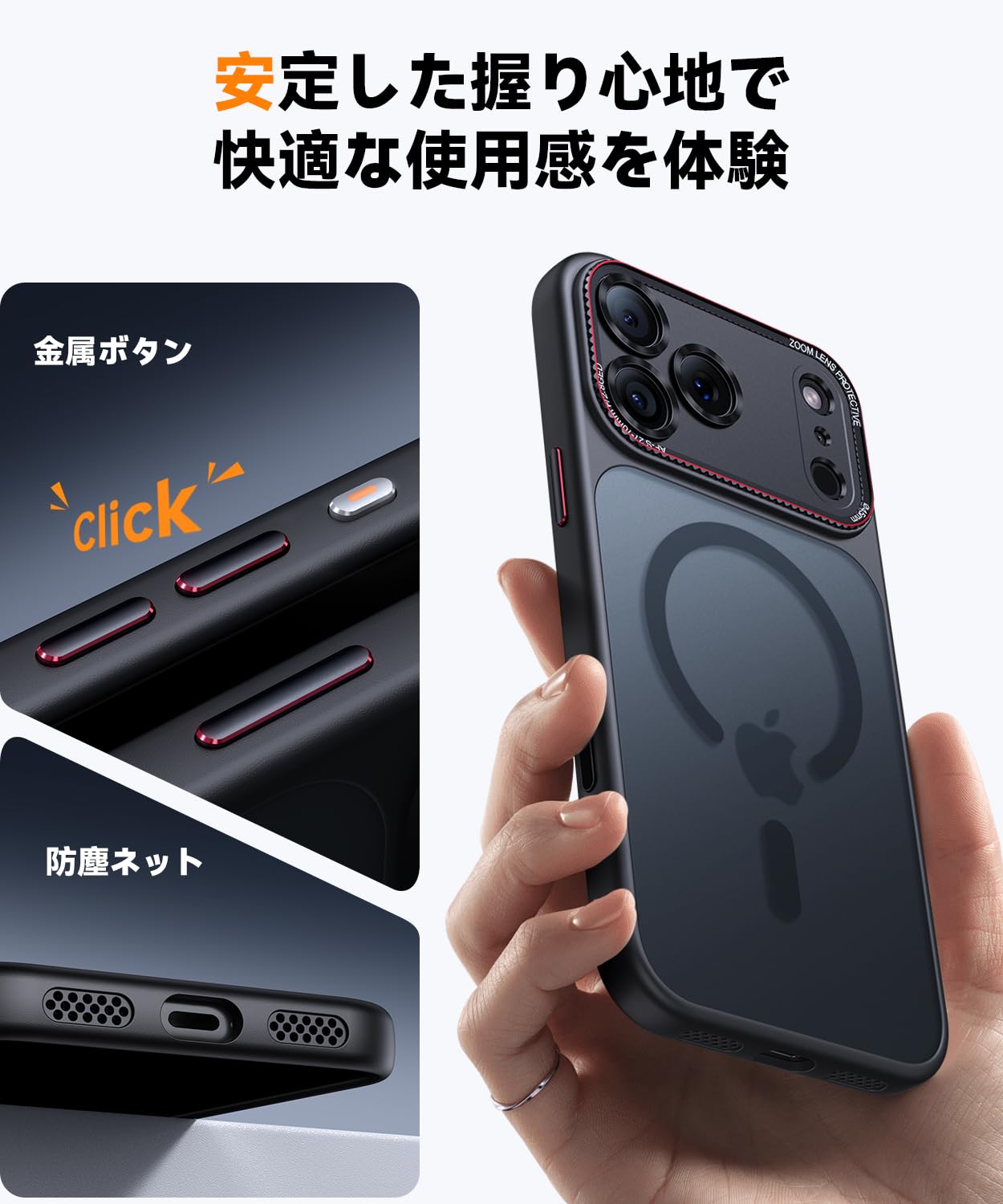 【米軍MIL規格・指紋防止】JUESHITUO iPhone 17 Pro Max 用の ケース 耐衝撃 マット マグネット搭載 いphone17promax 用の ケース MagSafe 充電対応 1Xスクリーン保護 黄ばみなし ストラップホール付き 半透明 カバー 6.9インチ ブラック