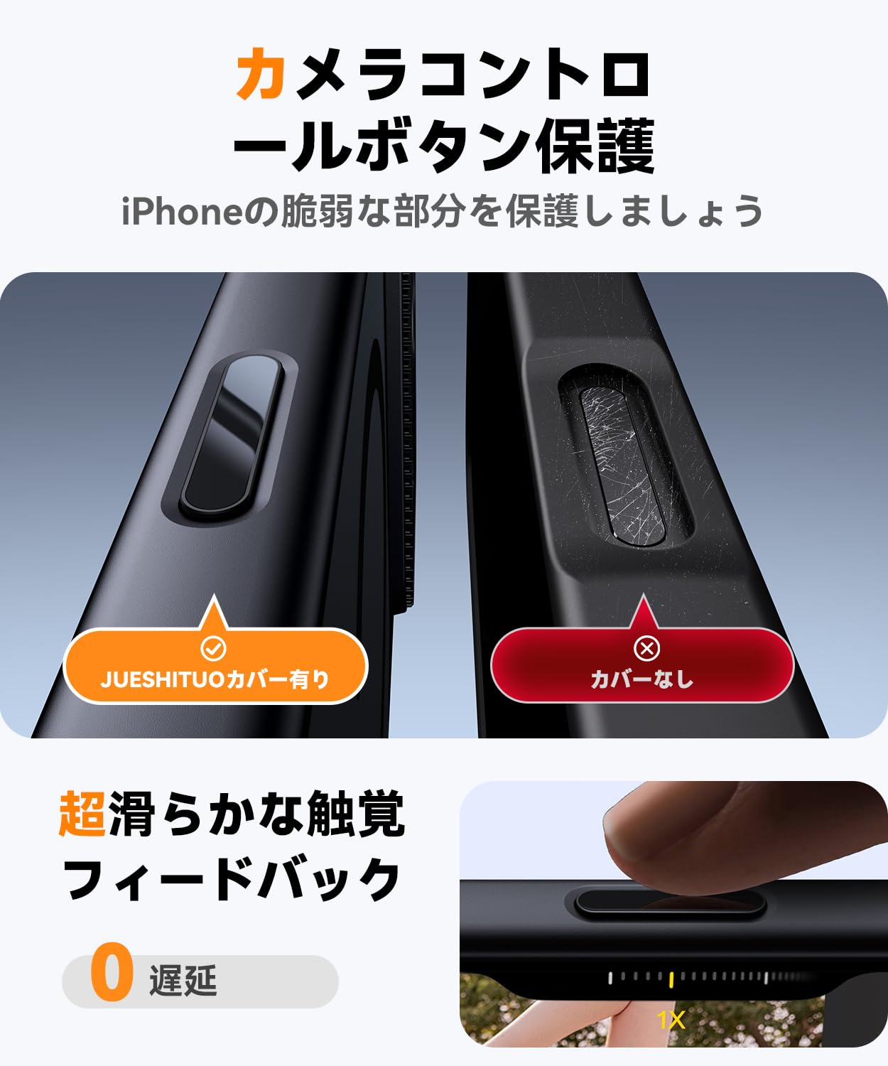 * 【カメラコントロールカバー付き】JUESHITUO iPhone 17 pro max ケースには、即時応答・ゼロ遅延のAIカメラボタンを内蔵。カメラボタンを完全に覆うため、キズ防止に効果的で、損傷や修理費用を節約します。凹んだボタンとはお別れ、片手でスムーズに操作できます。軽くタッチ、スワイプ、または押すだけで素早く撮影可能。完全な保護と即時応答の完璧なバランスをいつでもお楽しみください。