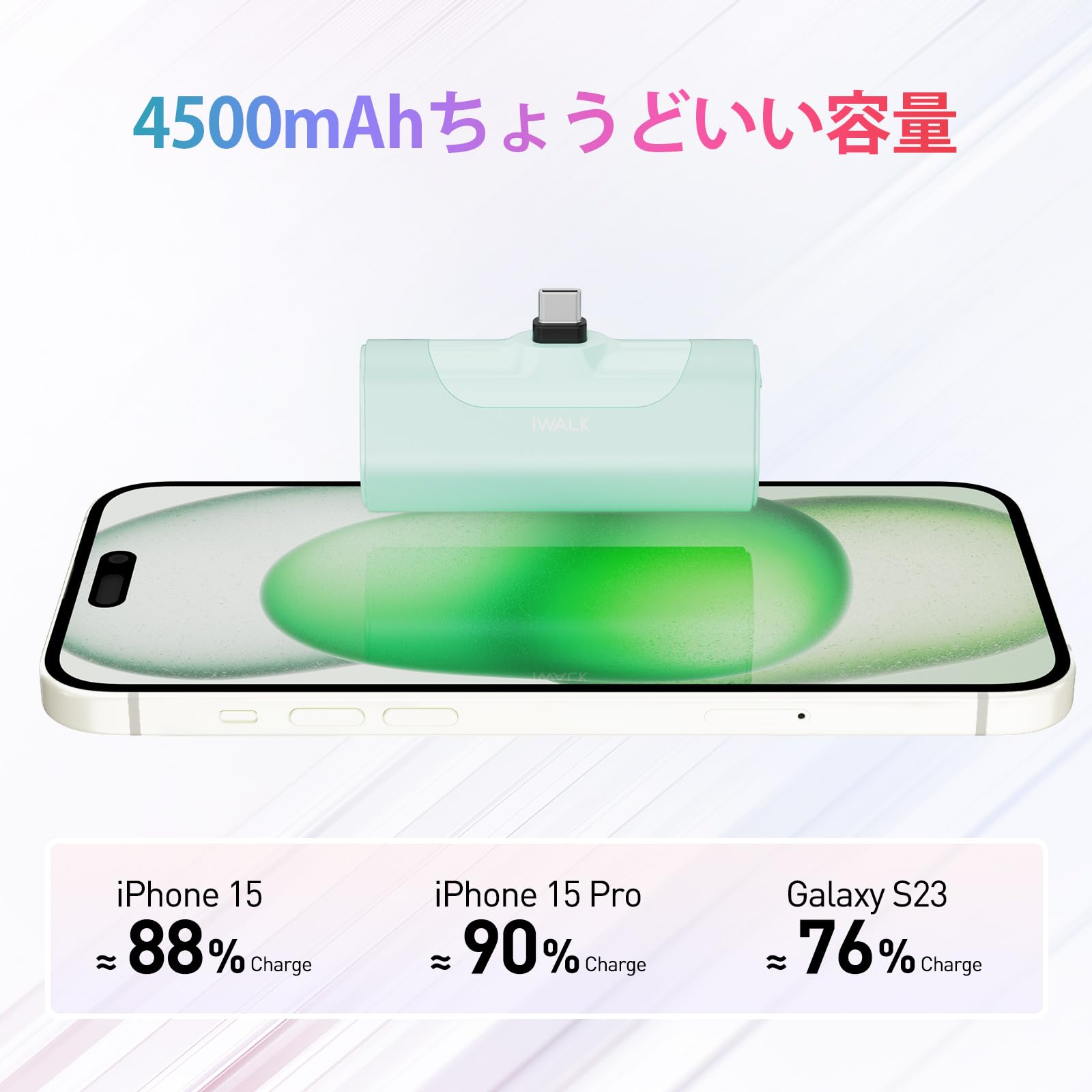 iWALK モバイルバッテリー タイプc 軽量 超小型 【20W急速充電・USB-C端子一体型】 4500mAh モバイル充電器 type c もばじゅう コネクター内蔵 パススルー機能 コンパクト 持ち運び便利 機内持ち込み可 iPhone 17/16/15シリーズ iPad AirPods Android対応 PSE認証済 グリーン