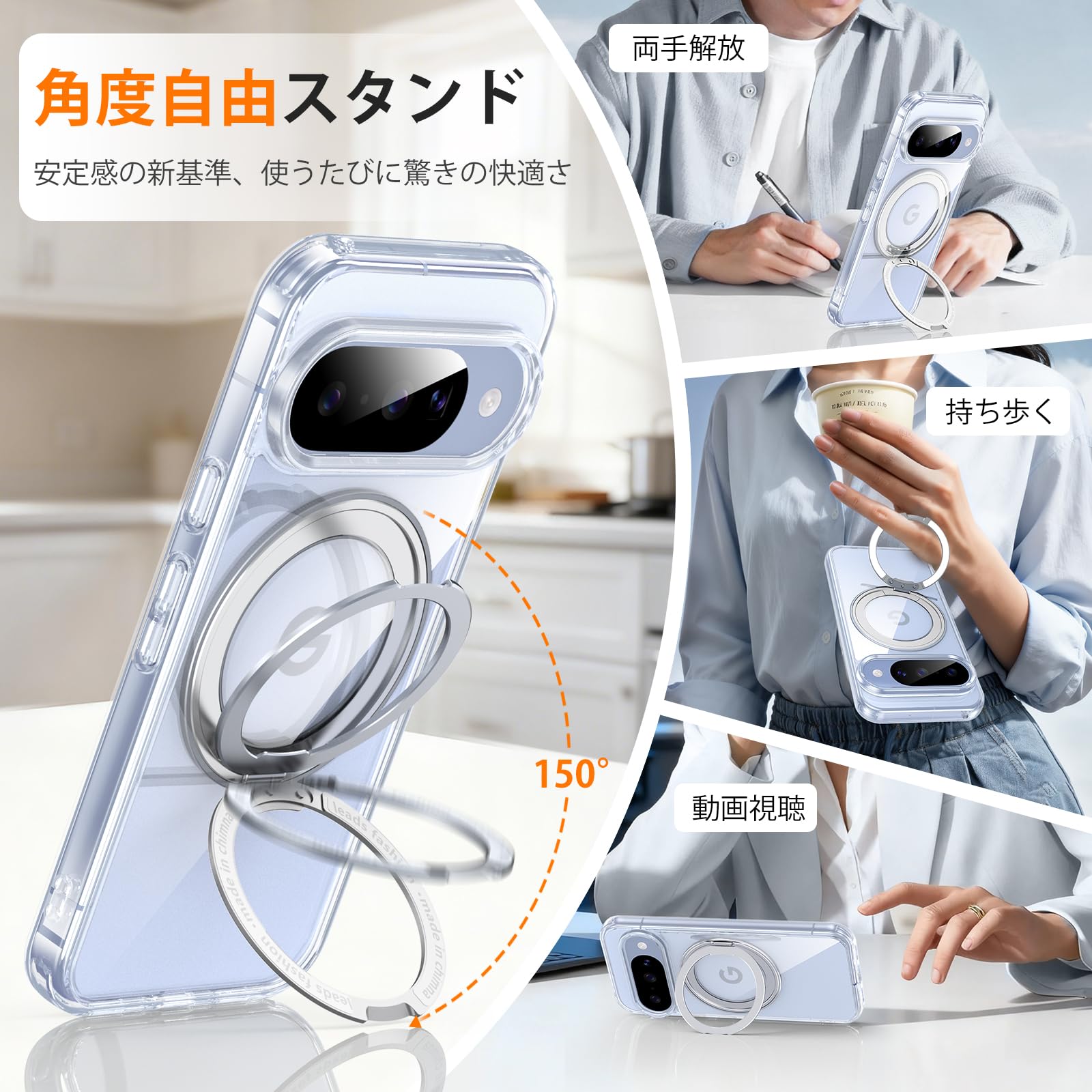 * 「360°回転スタンド・多機能デザイン」:背面に搭載された アルミ合金製のリングスタンド は、 360°自由回転・0°~150°の多角度調整 が可能。縦置き・横置きどちらでも最適な視野角を確保でき、動画視聴・ビデオ通話・学習・料理中のレシピ確認など幅広く活躍。リングとして指にかければ落下防止に便利。使用しない時は背面にフラットに収納でき、スマートな外観を維持します。