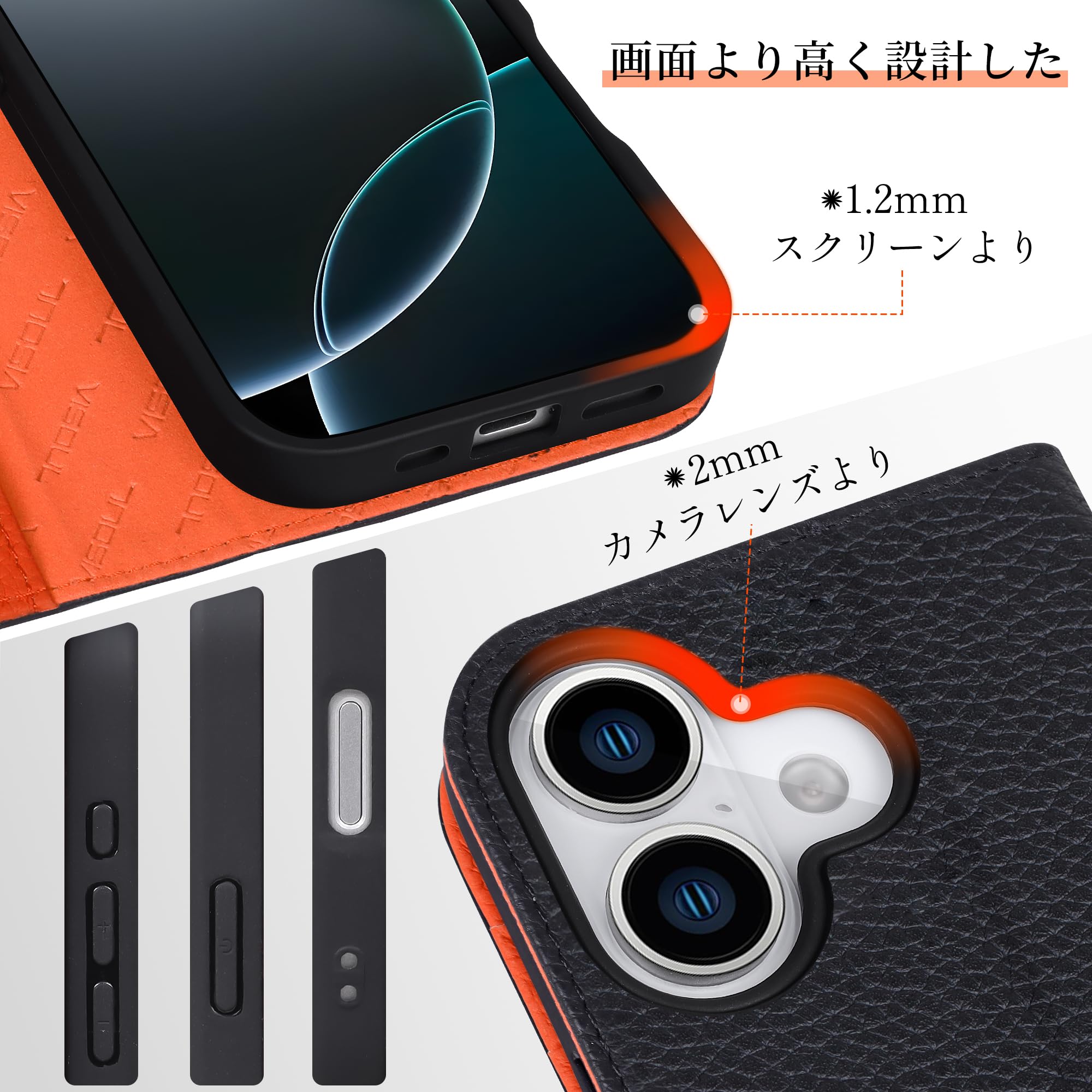 VISOUL iPhone 17 対応 ケース 手帳型 本革 アイフォン17 手帳型ケース MagSafe対応 スマホケース レザー カード収納 携帯カバー 横置きスタンド機能付き マグネット式 全面保護 柔軟なTPU素材 アイホン17 ブラック・オレンジ