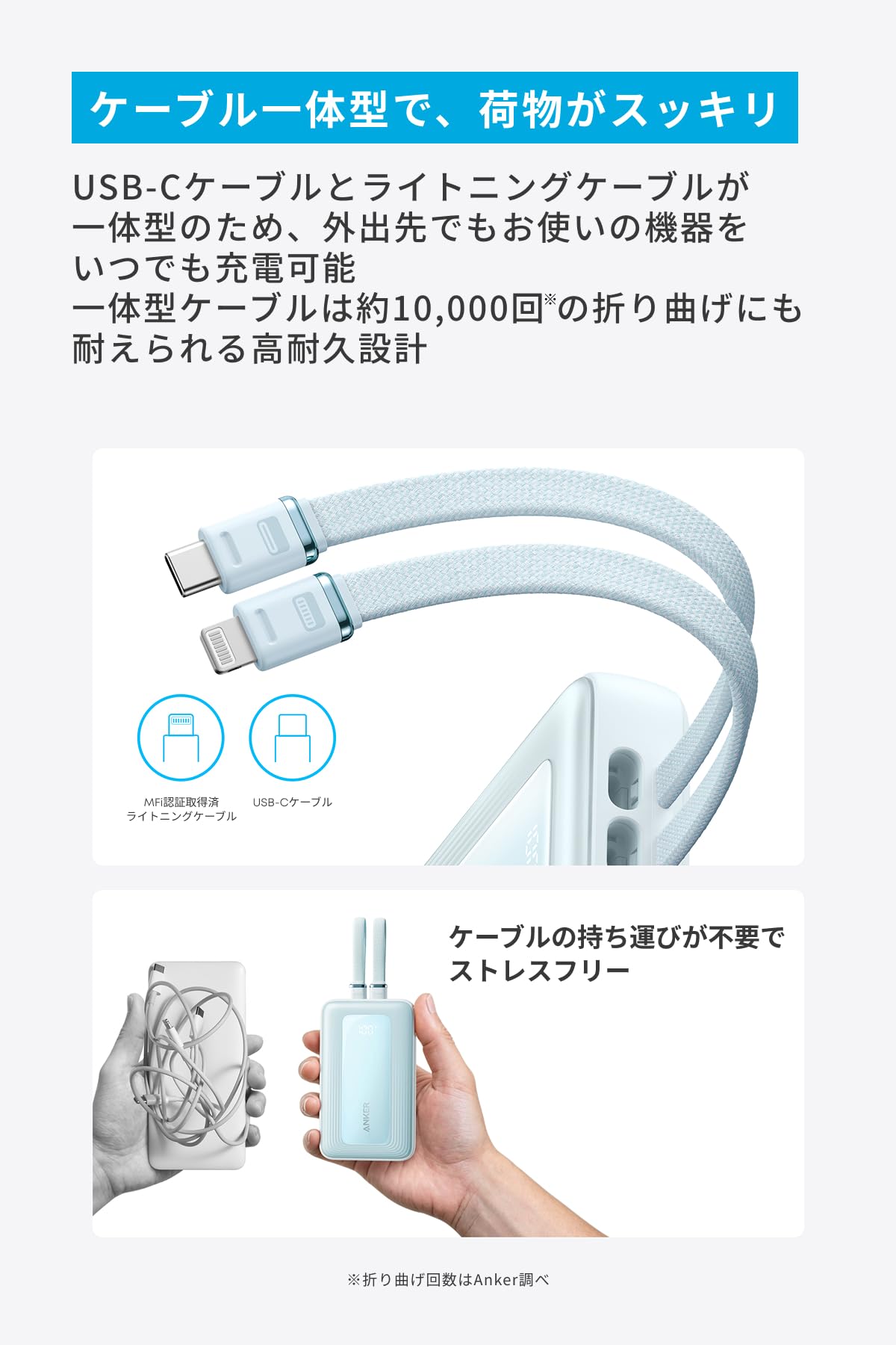 * ケーブル一体型で、荷物がスッキリ:USB-Cケーブルとライトニングケーブルが一体型のため、外出先でもお使いの機器をいつでも充電可能。一体型ケーブルは約10,000回の折り曲げにも耐えられる高耐久設計です。