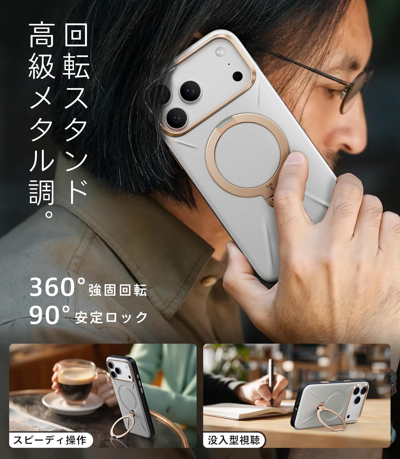 * 【360 度回転ゼンマイ式スタンド機能】「Ostand Q3 レザートーン」のスタンドは、縦置き・横置き両方に対応していて、角度調整も自由自在。動画視聴からビデオ会議・スマホスタンドとした使い方まで、あらゆるシーンで最適な角度をキープできる。また、スタンドは航空級アルミ合金を採用し、長期使用でも変形せず、繰り返し調整に耐える。金属の剛さとレザーの柔らかさが調和し、多場面で安定感を保ち安心使用可能。さらに、開閉時は精密腕時計風の「カチッ」リズムがあり、スマホをしっかり固定しズレを防ぐ。対応機種:For iPhone 17 pro max ケース